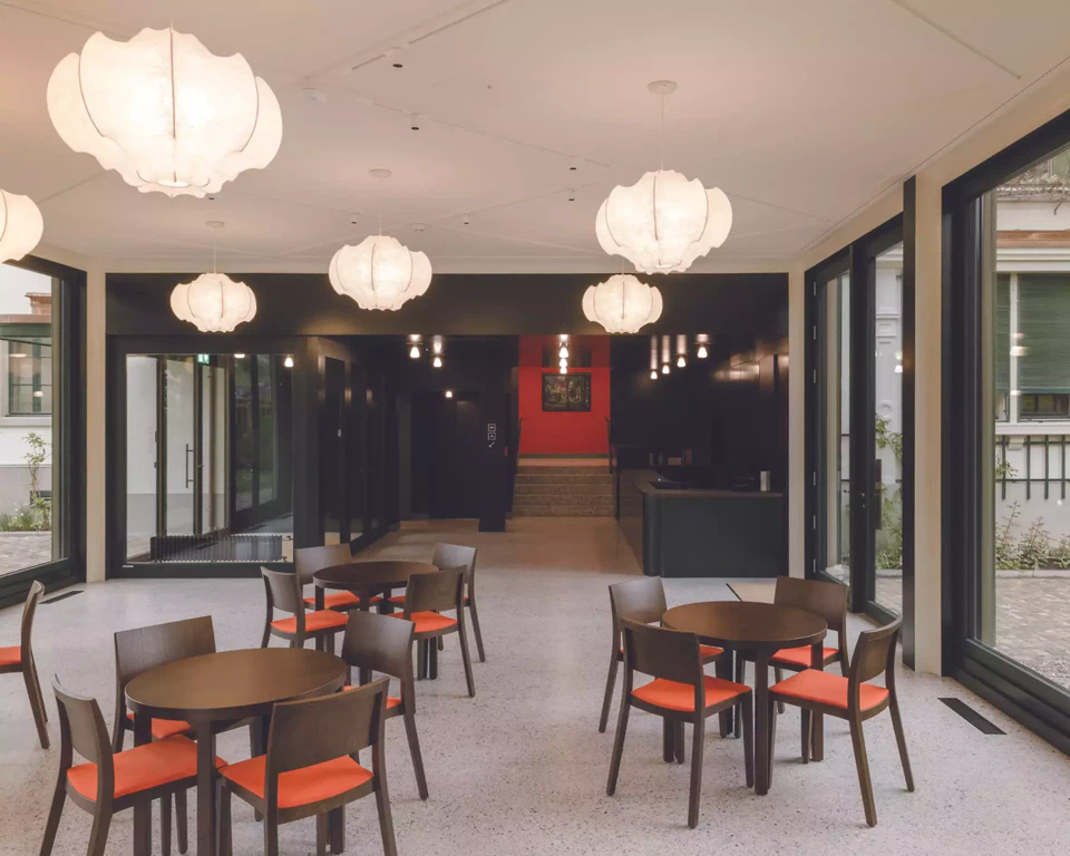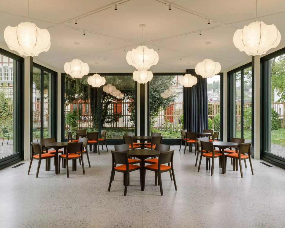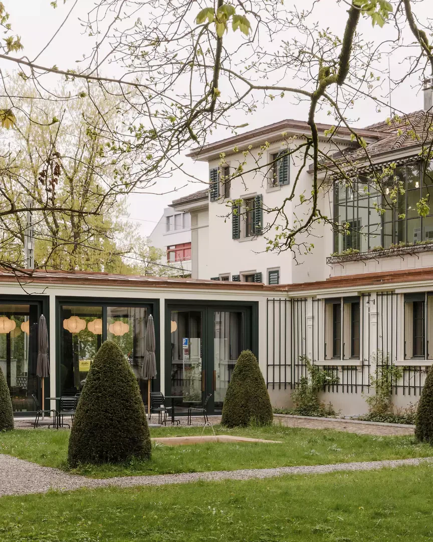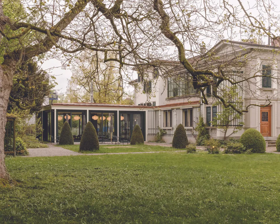 Le projet d’extension et de rénovation de la Villa Flora à Winterthour vient s’articuler à l’ancienne cuisine, qui ne sera plus nécessaire au fonctionnement muséal, par l’ajout d’un pavillon de jardin, et crée une nouvelle séquence d’entrée comprenant billetterie, boutique, vestiaire et une petite salle de réunion, directement reliée à l’escalier historique par un nouvel ascenseur. L’espace principal du pavillon, finement articulé, constitue un nouveau lieu de rencontre et d’échange, ainsi qu’un pendant contemporain au salon historique de Rittmeyer & Furrer. Le pavillon ferme le jardin côté rue et redéfinit la situation d’entrée, qui ne se situe plus dans l’espace contraint et bruyant de la rue, mais, comme une introduction à la collection, du côté plus intime du jardin. Il structure ainsi le jardin comme une nouvelle «pièce verte», prolongeant le parcours intérieur vers l’extérieur et maintenant lisible et sensible la cohérence spatiale et atmosphérique de l’ensemble historique dans son oasis urbaine végétale.