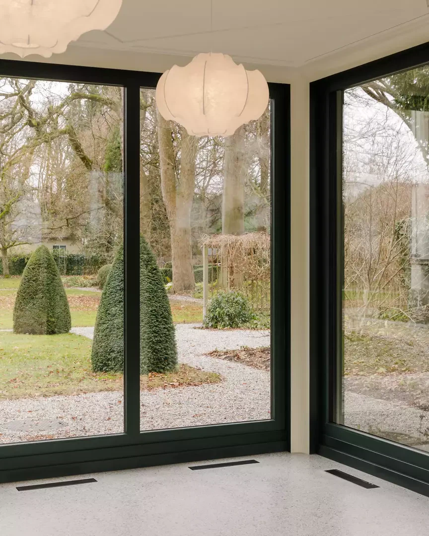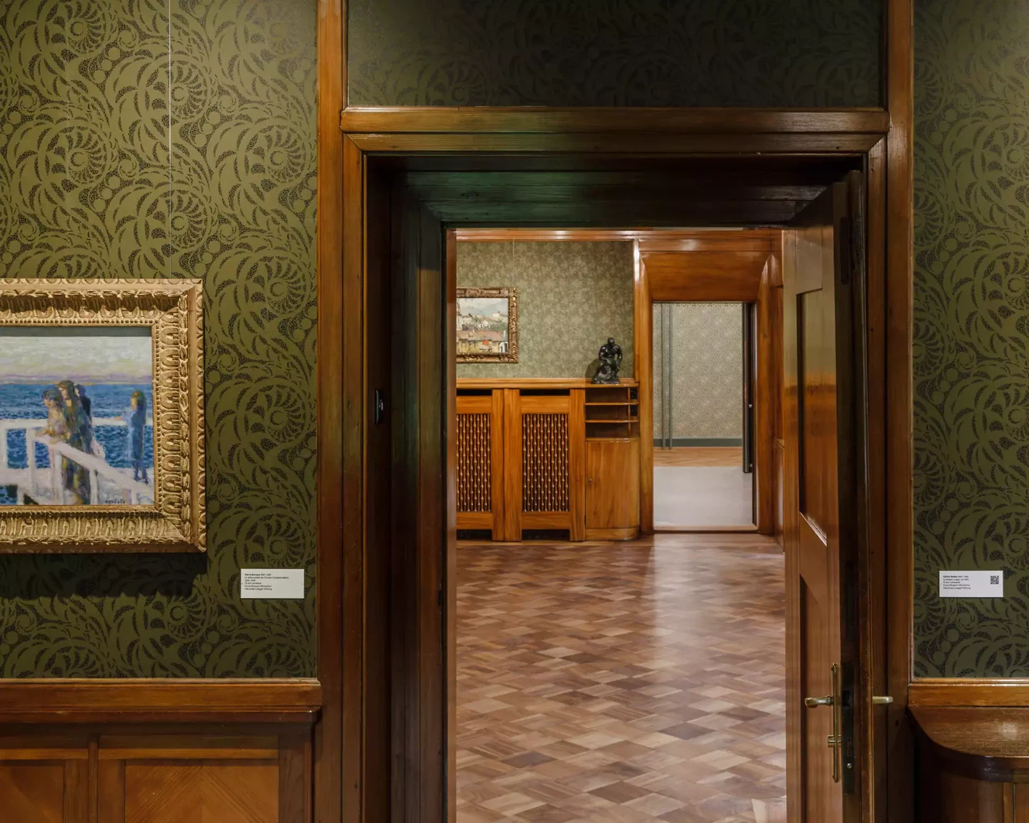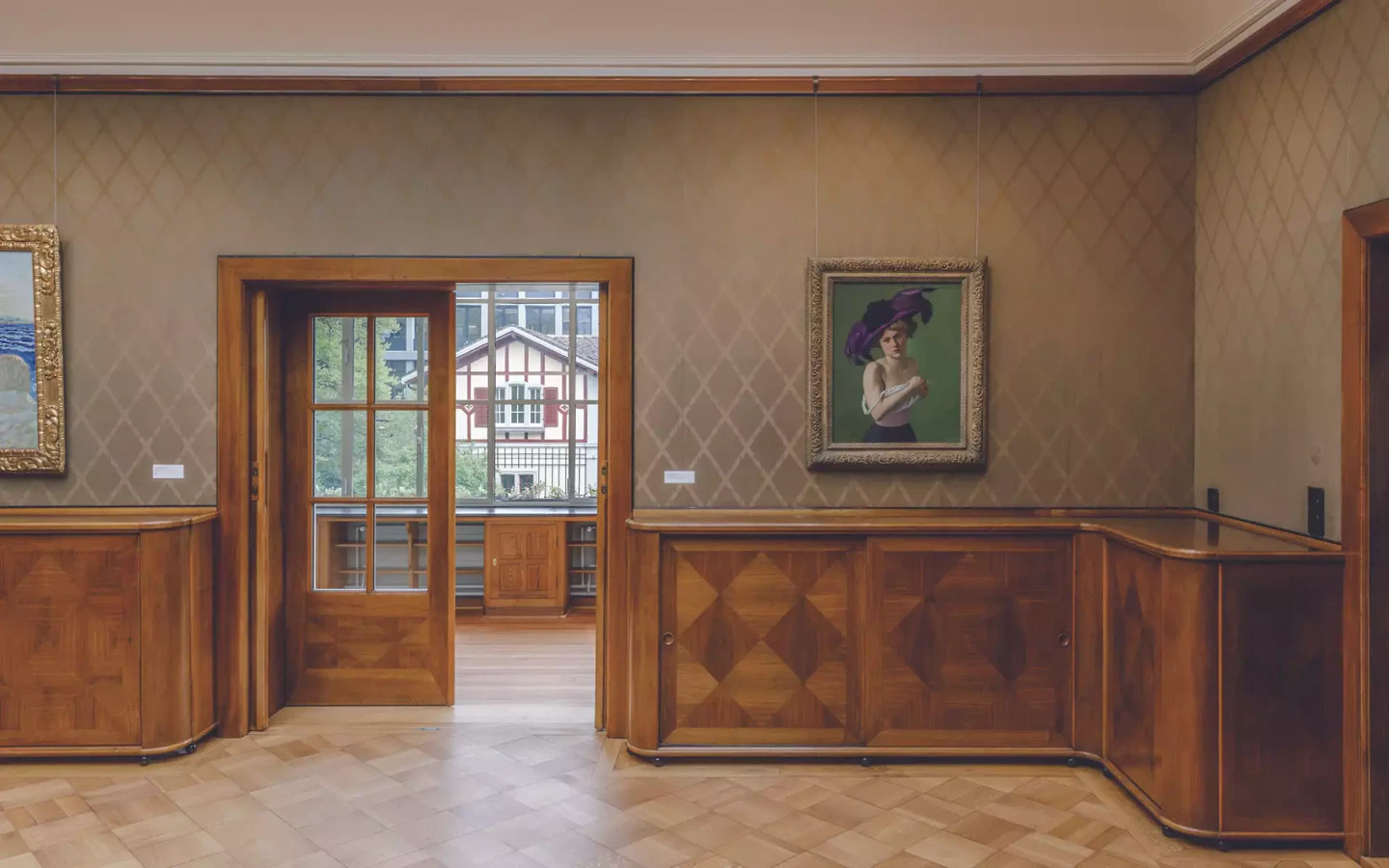 Les exigences énergétiques et constructives actuelles ont été intégrées au projet sans s’imposer visuellement. Les mesures techniques nécessaires à la stabilisation climatique, à la sécurité et à la distribution ont été mises en œuvre de manière à rester aussi discrètes que possible. La durabilité se manifeste ici avant tout dans la réutilisation et l’adaptation de l’existant ainsi que dans la vision à long terme du projet. La réussite de la Villa Flora ne repose pas sur un matériau unique, mais sur l’interaction précise de différentes stratégies: le bois dans le pavillon, la réinterprétation des papiers peints historiques et l’intégration soignée des techniques contemporaines. L’approche retenue, volontairement sobre, permet de préserver le caractère historique tout en proposant un musée adapté à notre époque. Bien qu’à première vue seuls les papiers peints aient été renouvelés et une extension ajoutée, de nombreuses mesures ont été mises en œuvre pour garantir la stabilité climatique et la sécurité des œuvres : le bâtiment a été partiellement repris en sous-œuvre, les conduits de ventilation ont été intégrés dans les gaines existantes, les installations électriques ont été dissimulées dans les plafonds en stuc et les murs tendus de tissu, et les nouvelles fenêtres sont des vitrages de sécurité à triple couche, sécurisés par alarme et intégrés avec précision dans la façade historique.
