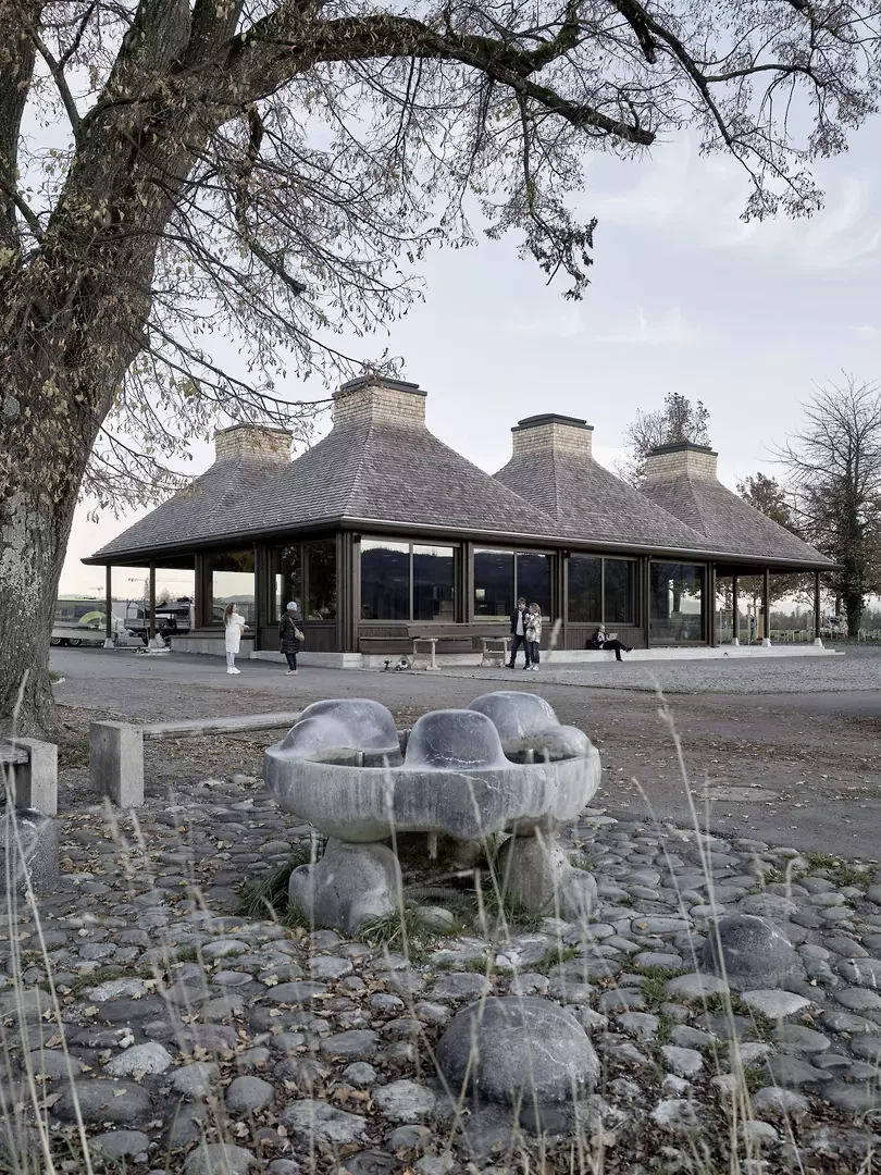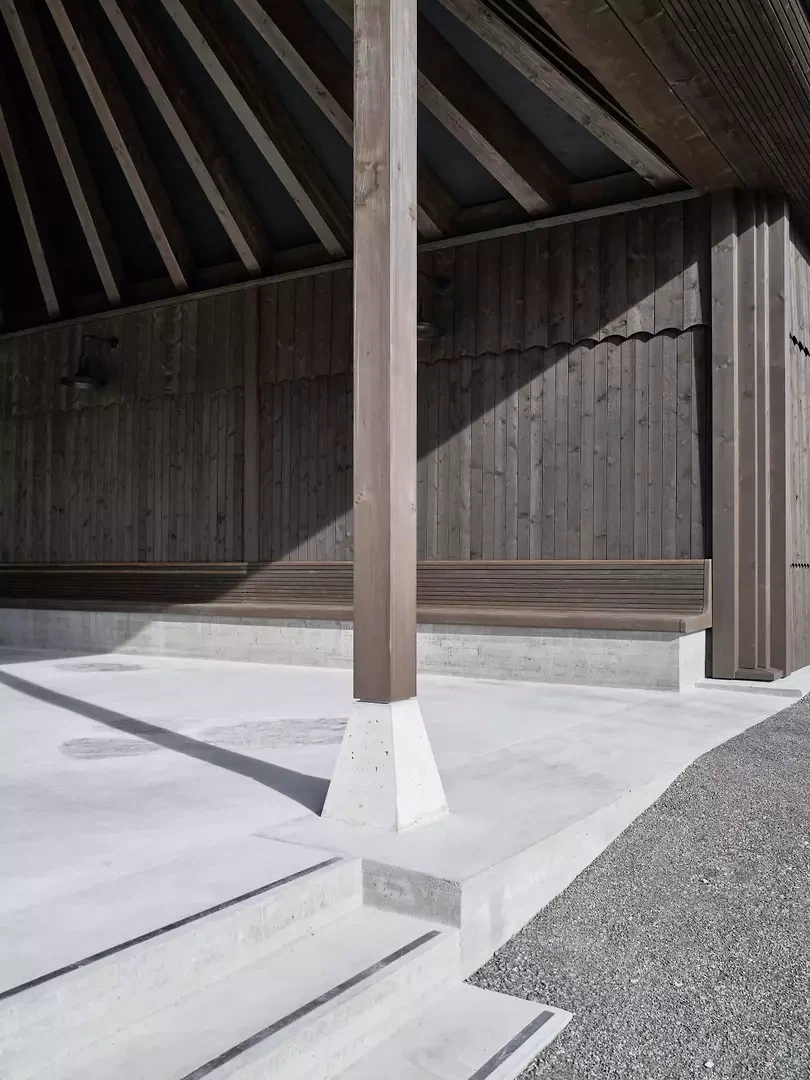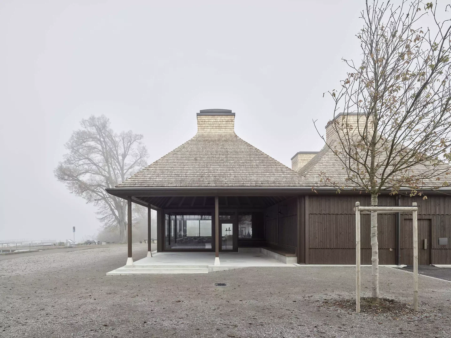 Situé directement sur l'embarcadère du lac de Greifen, à Uster, se dresse un pavillon de plain-pied doté de six toits caractéristiques. Avec ses toitures en porte-à-faux sur tout le pourtour, le bâtiment fait face à la fois au lac et à l'arrêt de bus situé au nord, devenant ainsi un lieu de liaison entre le paysage, les infrastructures et la vie publique. Le volume se divise en six unités carrées de taille égale, chacune dotée de son propre toit. Les structures de toiture, pourvues de lucarnes, restent libres au centre à la manière d’une charpente de tente et remplissent différentes fonctions. Dans le restaurant, deux toits marquent l’atmosphère de l’espace, tandis qu’à l’extérieur, des modules de toiture individuels offrent une protection ciblée contre les intempéries et le soleil. Au-dessus de la cuisine, l’espace sous le toit est utilisé pour les installations techniques du bâtiment. Le restaurant, largement vitré, offre sous l’espace sous-toiture une vue dégagée sur le paysage riverain et le lac. À la manière d’un parapluie, les chevrons s’organisent en rayons autour de la lucarne – l’épicéa lasuré foncé, rempli de roseaux, confère à la construction chaleur et profondeur. Deux espaces extérieurs couverts, formés comme des toitures autonomes, protègent les clients du soleil au bord du lac et de la pluie près du kiosque. Le long de la façade, sous les toitures ouvertes, des bancs sont disposés – comme on en trouve aux arrêts de tramway en ville. Ils invitent les visiteurs à s’attarder un instant et font du pavillon un lieu de rencontre public. Le restaurant au bord du lac, situé à la limite sud d'Uster, crée un lieu identitaire au sein de cette zone de loisirs de proximité : ouvert, accessible et solidement ancré dans le quotidien de la population.