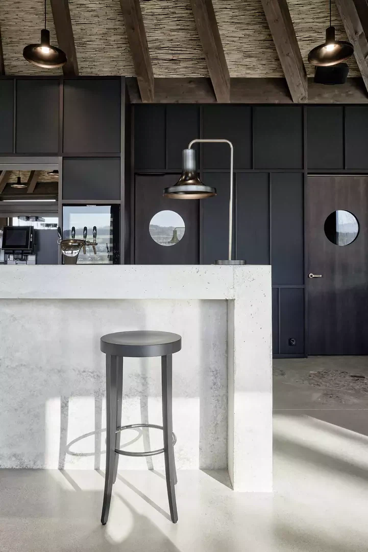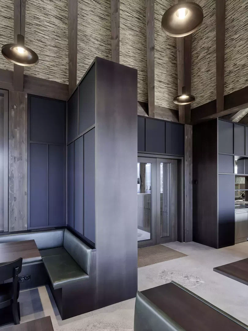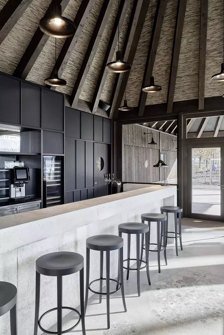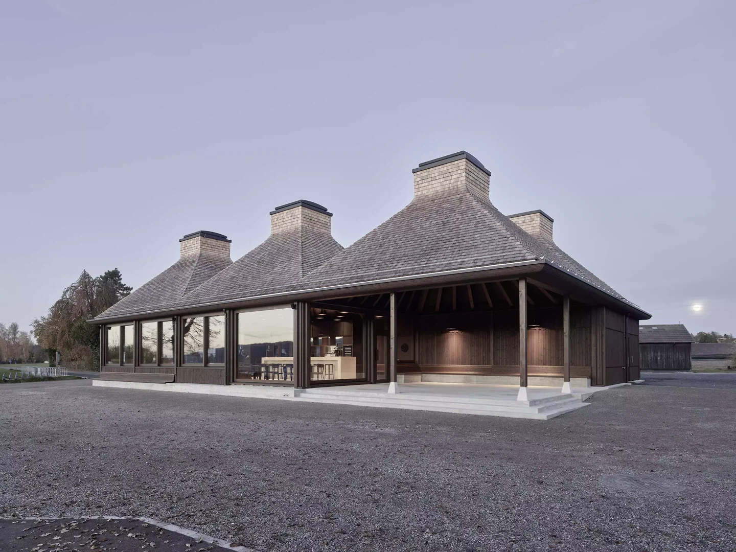 Situé directement sur l'embarcadère du lac de Greifen, à Uster, se dresse un pavillon de plain-pied doté de six toits caractéristiques. Avec ses toitures en porte-à-faux sur tout le pourtour, le bâtiment fait face à la fois au lac et à l'arrêt de bus situé au nord, devenant ainsi un lieu de liaison entre le paysage, les infrastructures et la vie publique. Le volume se divise en six unités carrées de taille égale, chacune dotée de son propre toit. Les structures de toiture, pourvues de lucarnes, restent libres au centre à la manière d’une charpente de tente et remplissent différentes fonctions. Dans le restaurant, deux toits marquent l’atmosphère de l’espace, tandis qu’à l’extérieur, des modules de toiture individuels offrent une protection ciblée contre les intempéries et le soleil. Au-dessus de la cuisine, l’espace sous le toit est utilisé pour les installations techniques du bâtiment. Le restaurant, largement vitré, offre sous l’espace sous-toiture une vue dégagée sur le paysage riverain et le lac. À la manière d’un parapluie, les chevrons s’organisent en rayons autour de la lucarne – l’épicéa lasuré foncé, rempli de roseaux, confère à la construction chaleur et profondeur. Deux espaces extérieurs couverts, formés comme des toitures autonomes, protègent les clients du soleil au bord du lac et de la pluie près du kiosque. Le long de la façade, sous les toitures ouvertes, des bancs sont disposés – comme on en trouve aux arrêts de tramway en ville. Ils invitent les visiteurs à s’attarder un instant et font du pavillon un lieu de rencontre public. Le restaurant au bord du lac, situé à la limite sud d'Uster, crée un lieu identitaire au sein de cette zone de loisirs de proximité : ouvert, accessible et solidement ancré dans le quotidien de la population.