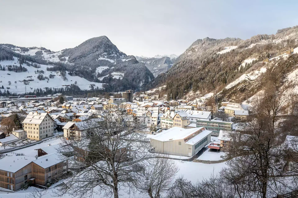 Le bâtiment de la halle a été conçu selon les exigences Minergie-P et réalisé en construction préfabriquée en bois. Cela a permis de réduire au maximum la durée du chantier sur le site scolaire: les éléments en bois préfabriqués ont été montés sur place en quelques semaines seulement, tout en garantissant une réalisation économique. L’enveloppe du bâtiment est constituée d’éléments en bois fortement isolés, tandis que la toiture est réalisée sous forme de toit incliné durable. Les fenêtres bois-métal sont équipées d’un triple vitrage isolant. Dans la salle, de généreux sheds orientés au nord apportent une abondante lumière naturelle. Le bâtiment en éléments bois est revêtu d’un bardage ventilé en bois durable, adapté au contexte local. Les lésènes verticales, les panneaux en lambris brut non collé à rainure et languette ainsi que les revêtements intérieurs sont réalisés en épicéa local issu de la forêt de Grüsch. Un couronnement périphérique de toiture relie architecturalement les bâtiments existants du site et la nouvelle salle polyvalente en un ensemble cohérent.