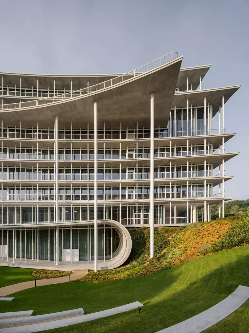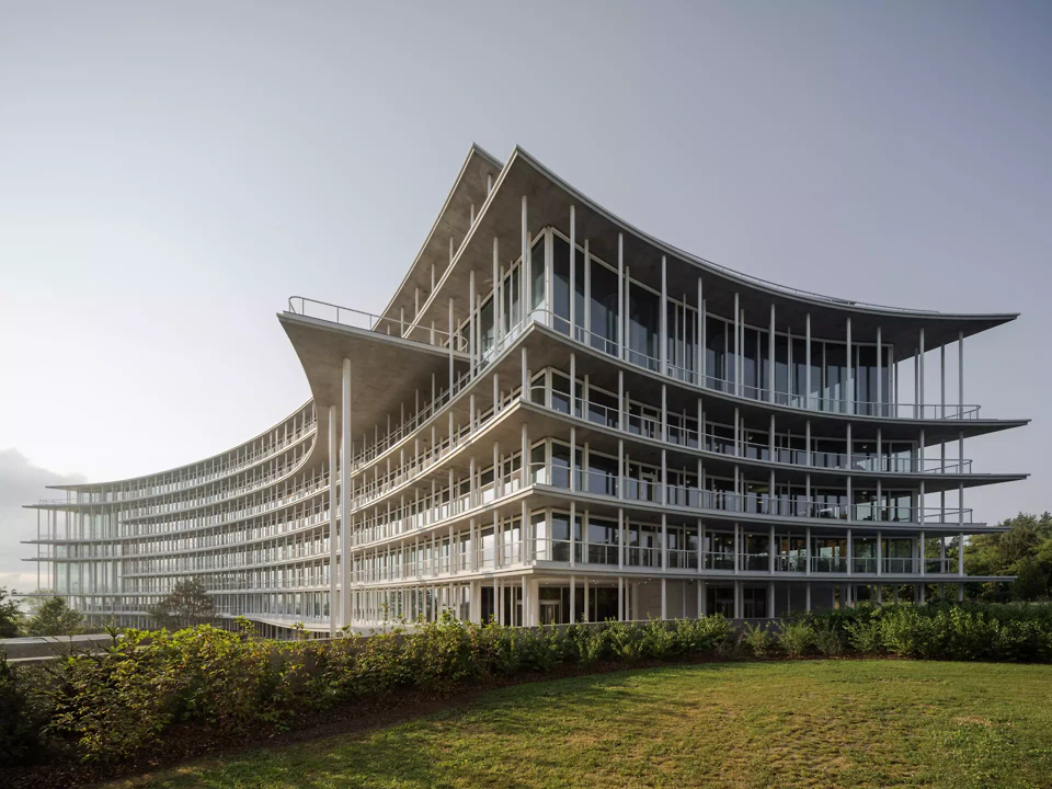 Le bâtiment se distingue par ses coursives courbées qui servent de protection solaire passive pour les façades vitrées tout en offrant des espaces extérieurs couverts et accessibles pour les clientes et les collaborateursrices. Ces coursives sont partiellement décalées les unes par rapport aux autres et diffèrent en fonction de l’orientation et des fonctions adjacentes – le bâtiment respire. Des piliers blancs élancés soutiennent ces coursives et se fondent avec d’autres éléments verticaux tels que les descentes d’eaux pluviales et les rails des protections solaires textiles. Les coursives profondes réduisent les reflets sur le vitrage et, combinées avec le profil fin du nez de dalle, renforcent l’apparence légère des façades.