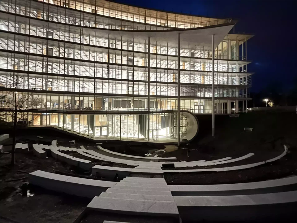 À l’intérieur, les dalles se transforment en rampes ou en escaliers, permettant des transitions fluides entre les niveaux. Cette topographie intérieure est particulièrement visible dans et autour du grand auditorium, où les gradins courbés se prolongent vers le jardin à l’extérieur, devenant ainsi un théâtre en plein air. Dans des zones spécifiques, les planchers sont découpés pour créer des espaces à plusieurs niveaux, comme à l’entrée principale au nord ou dans les Espaces Collaboratifs face au lac. Ces irrégularités sont conçues pour évoquer des éléments trouvés dans la nature.