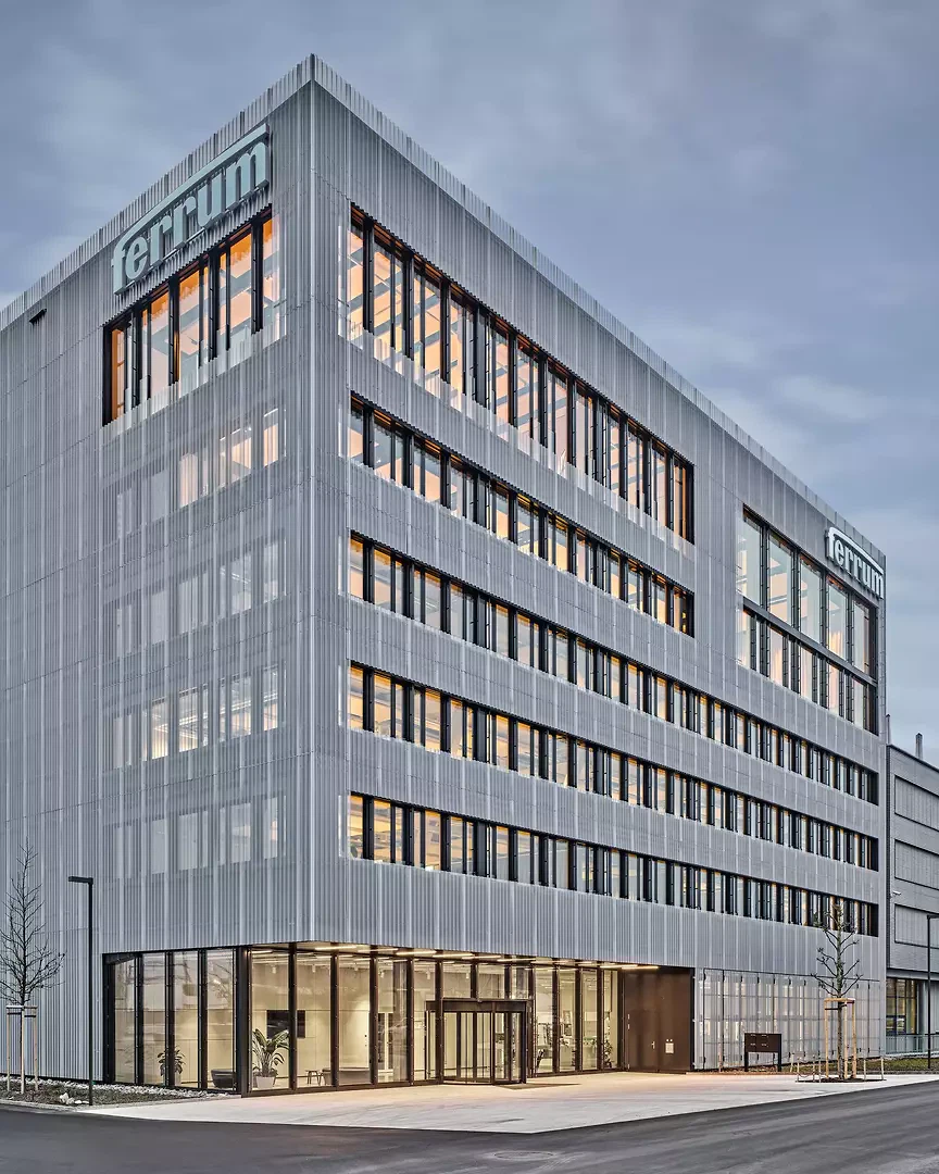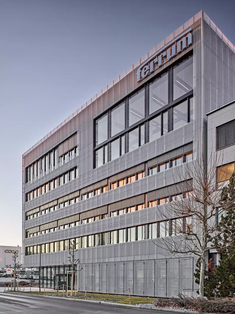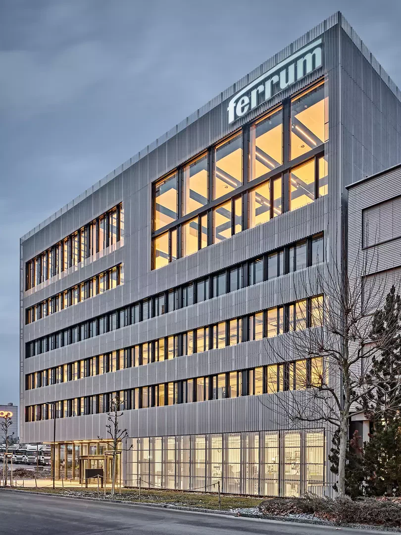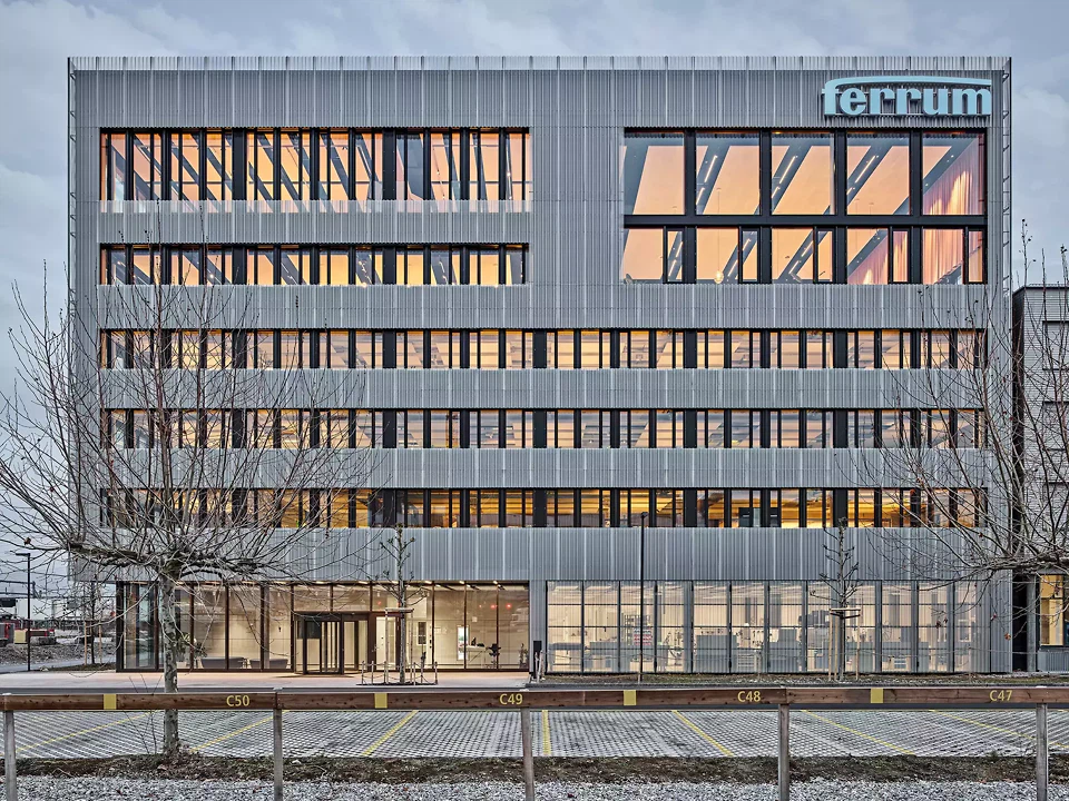 Les différentes zones fonctionnelles et hauteurs sont enveloppées par une façade métallique perforée et ventilée qui unifie l’ensemble. En continuité matérielle avec les bâtiments existants, l’extension se voit conférer une image homogène et une expression industrielle affirmée. Le groupe Ferrum est notamment l’un des leaders mondiaux dans la production d’installations de fermeture de boîtes métalliques ainsi que de centrifugeuses. Environ 400 personnes travaillent au siège principal de Schafisheim dans les domaines de la production, de l’ingénierie et du développement, du montage, de la logistique et des services centraux.