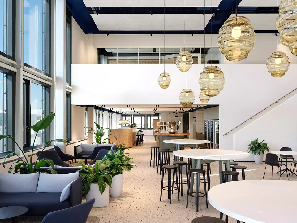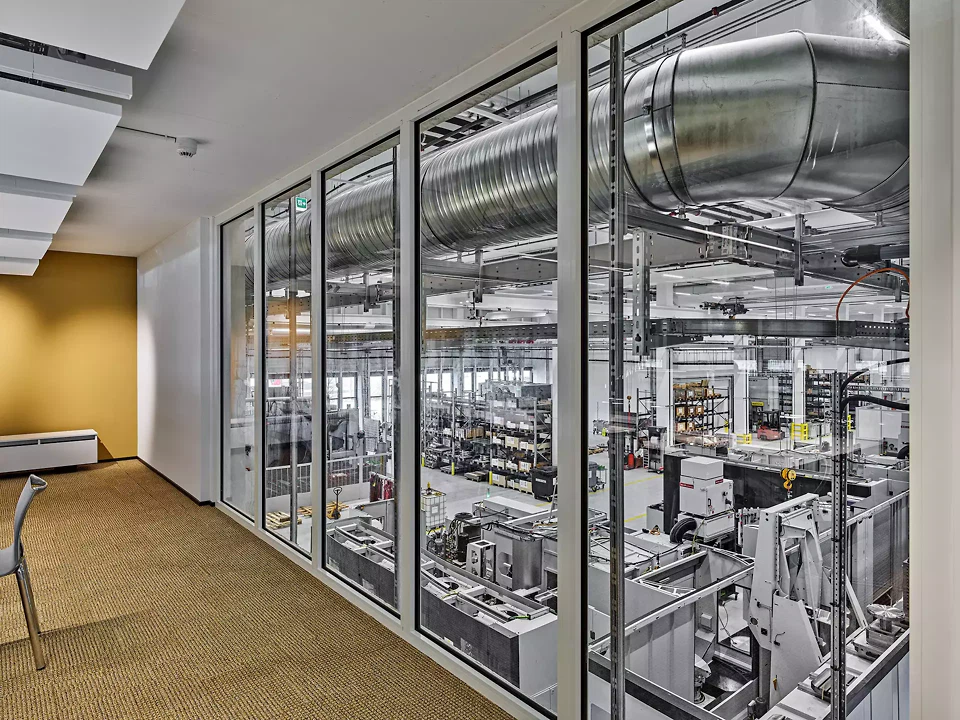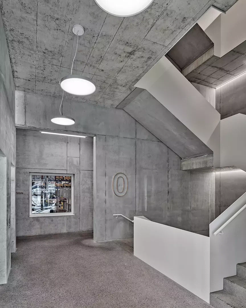 Le concept prévoit la superposition des halles de production et d’un vaste paysage de bureaux horizontal posé au-dessus. Cette particularité rompt avec les typologies traditionnelles et les inverse. Lisible de l’extérieur de manière plutôt subtile, cette superposition aboutit à un bâtiment très compact, durable et d’une hauteur de 25 mètres.