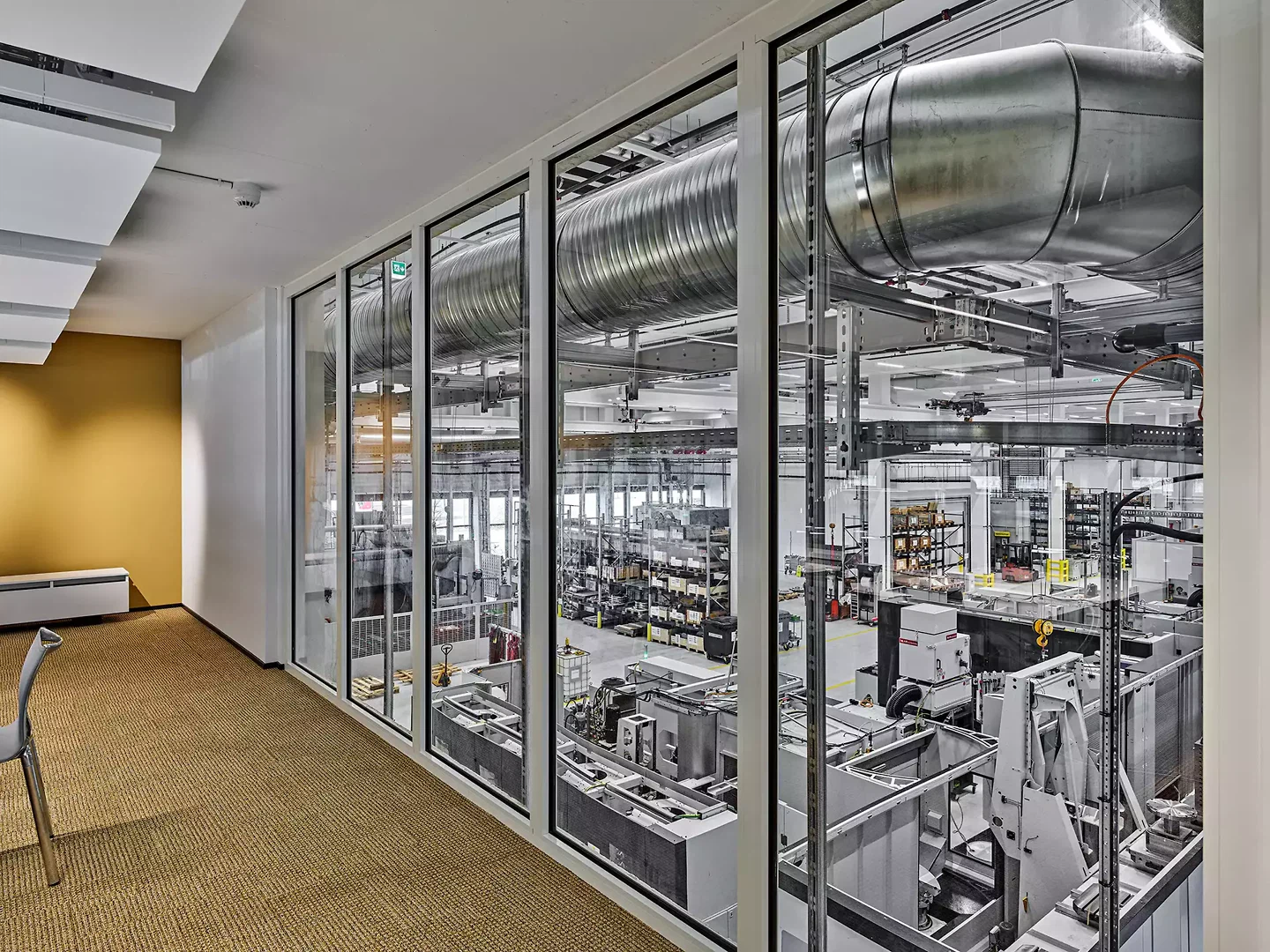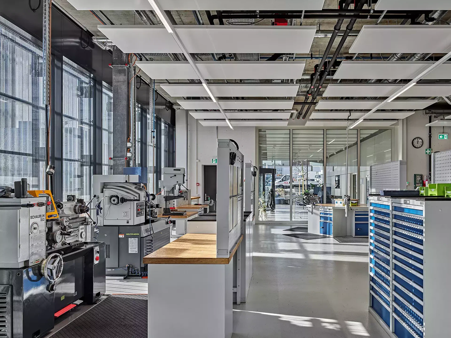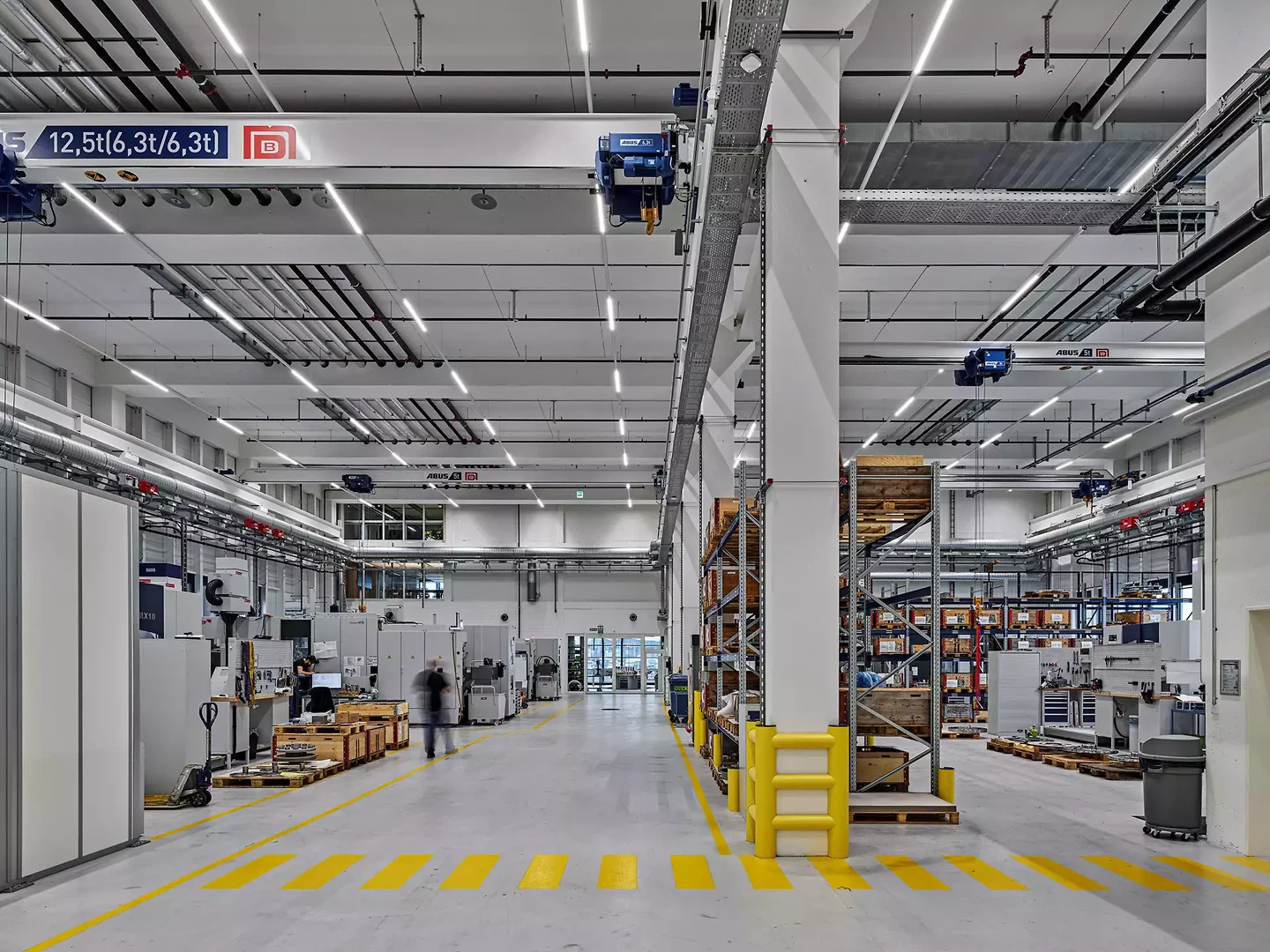 Il convient de souligner la mixité d’usages entre des halles de production présentant des exigences techniques très complexes (portées, comportement vibratoire contrôlé, et cetera) et des espaces de bureaux correspondant à un siège d’entreprise représentatif et contemporain. Cette dualité programmatique marque en permanence le processus de conception et de planification et constitue la base du concept architectural des mondes superposés de la production et du bureau.