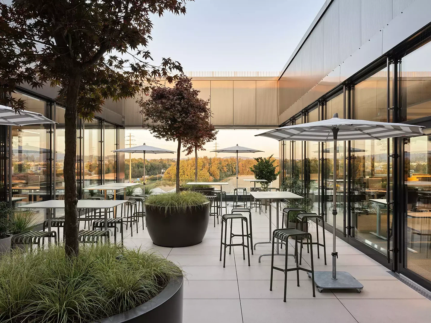 Le concept de durabilité du bâtiment industriel a été conçu de manière intégrée dès le départ. Il place au centre de la réflexion la réduction de l’imperméabilisation des sols, la forte compacité du volume bâti avec une emprise au sol minimale, des trajets courts ainsi qu’une diminution des livraisons. Un espace extérieur de grande qualité ainsi que la mise à disposition de zones de détente et de séjour végétalisées dans les cours intérieures occupent également une place importante dans ce contexte marqué par l’industrie, le long de la route principale A1.