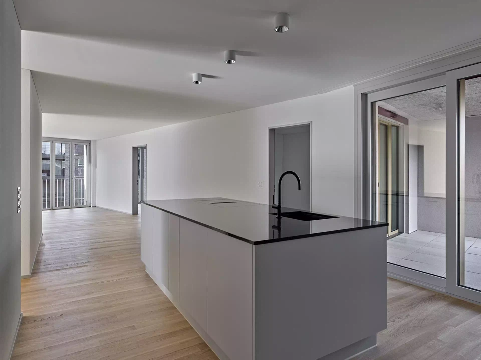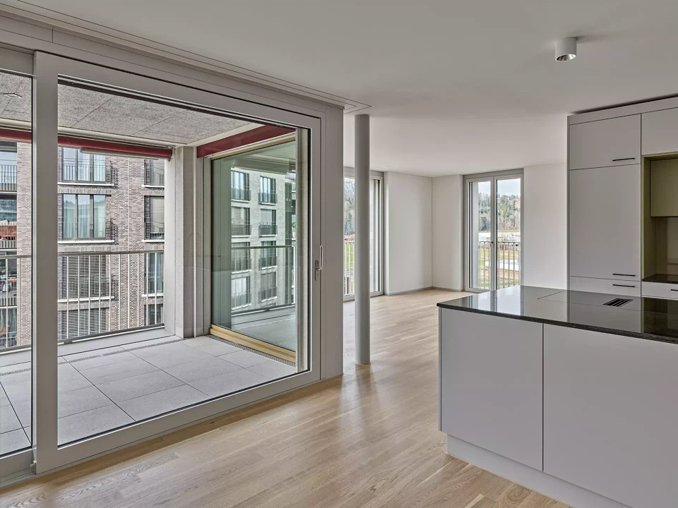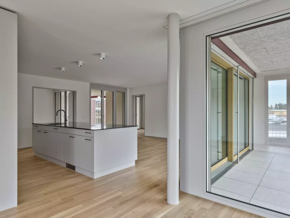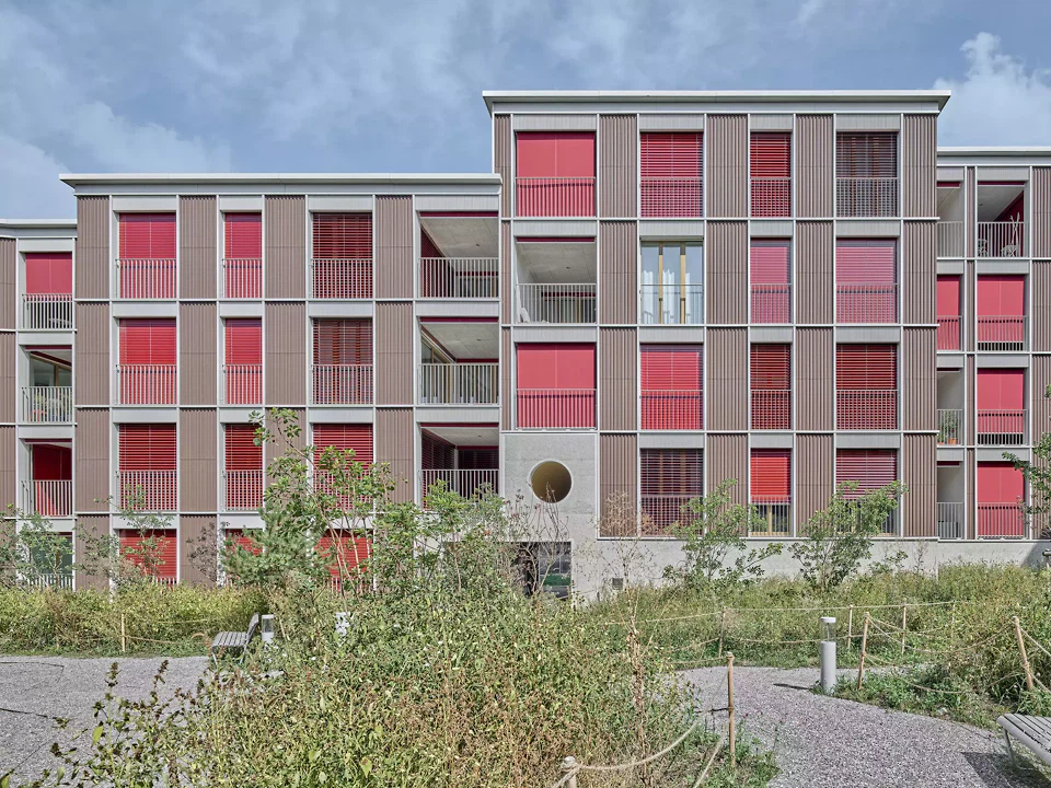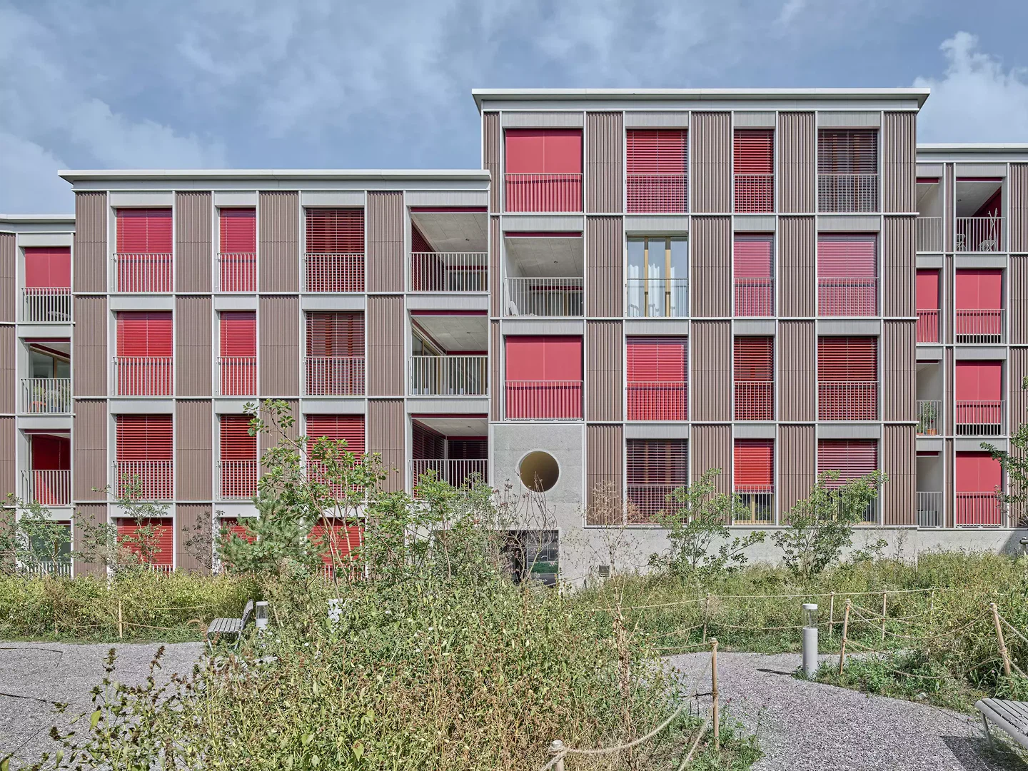 Il y a plusieurs années, le projet immobilier Dietlimoos-Lebern a donné le coup d'envoi à la création d'un quartier situé juste à la limite de la ville, destiné à désengorger Zurich. Actuellement, la partie Dietlimoos-Moos est en cours de réalisation: coincée entre l'autoroute et la Zürichstrasse, elle joue le rôle de médiateur entre la ville et la campagne. Cette situation a influencé le projet de Züst Gübeli Gambetti pour un immeuble d'habitation esquissé dans le projet préliminaire et son exigence d'une différenciation claire entre la façade côté ville et celle côté cour. Il fallait pour cela relever deux défis : le terrain en pente et les nuisances sonores provenant de la Zürichstrasse.