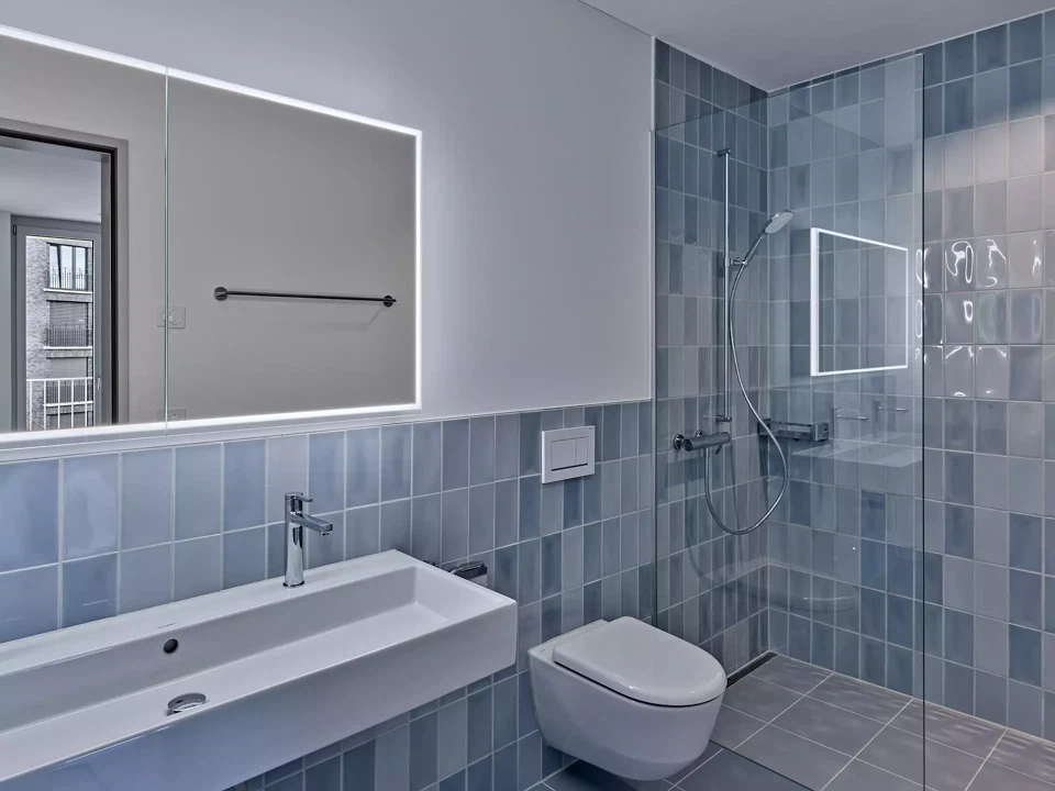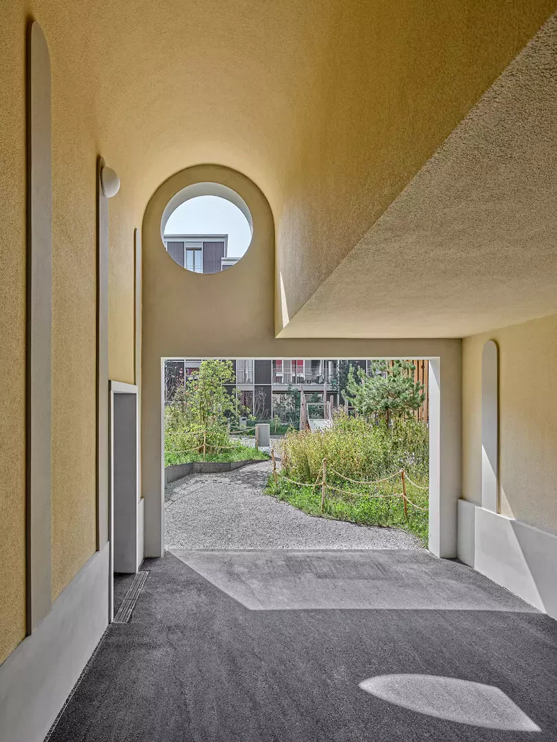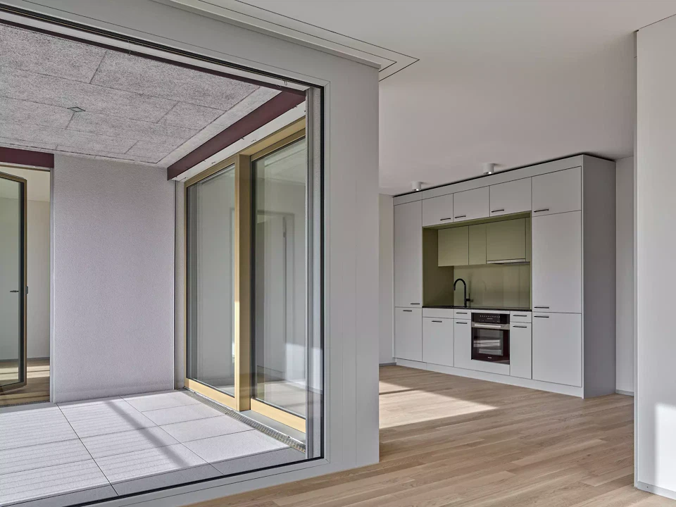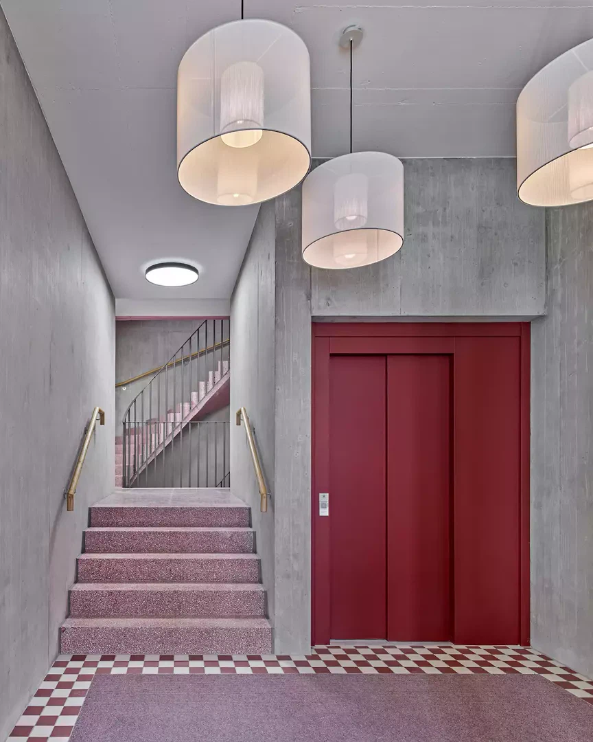 Dans la cour, l'encadrement et la mise en valeur de chaque appartement soulignent non seulement leur diversité, mais aussi leur échelle délicate, créant ainsi l'image d'une façade ouverte sur le jardin, caractérisée par une utilisation individuelle. Soutenu par des dalles en terre cuite finement profilées et réfractaires au bruit, qui alternent avec des loggias profondes en tant que remplissages verticaux, il en résulte une ambiance chaleureuse qui encadre le centre vert commun. Au Moosweg, un accès à la cour en forme de hall fait un geste accueillant et devient en quelque sorte l'occasion d'une variation typologique qui atténue le problème du bruit dans le nord.
