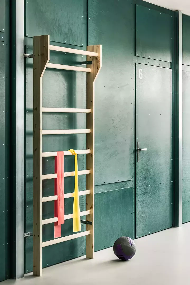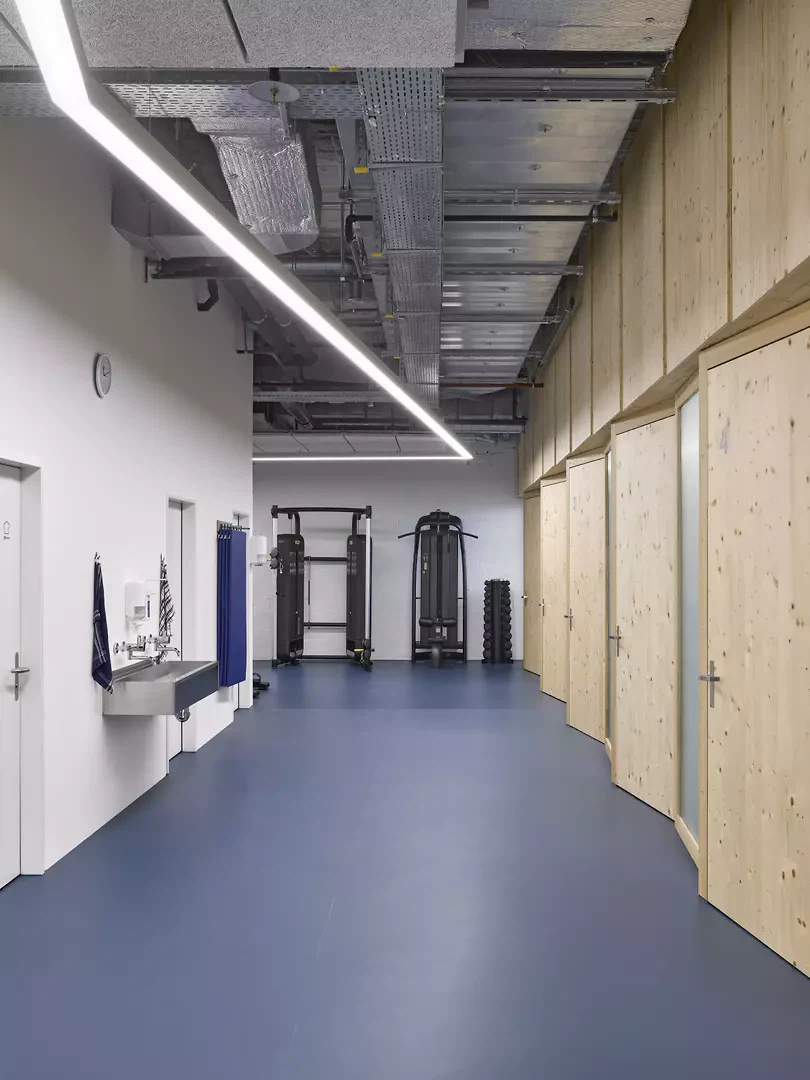 Une paroi composée de panneaux en bois fabriqués en série combine des éléments opaques et translucides. Les modules sont insérés dans des cadres en hêtre soigneusement réalisés et décalés les uns par rapport aux autres de cinq degrés. Un verre rainuré diffuse la lumière de manière homogène dans l’espace d’entraînement.