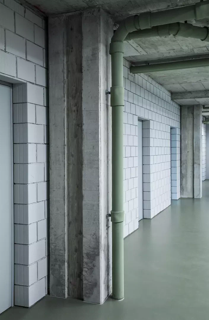 Une paroi en brique silico-calcaire s’efface volontairement face à la structure porteuse en béton, à la fois sculpturale et expressive. Des joints creusés et en retrait précisent la maçonnerie et rendent les éléments lisibles comme une couche légère. Les largeurs différenciées des joints horizontaux et verticaux créent un relief subtil, presque ornemental.