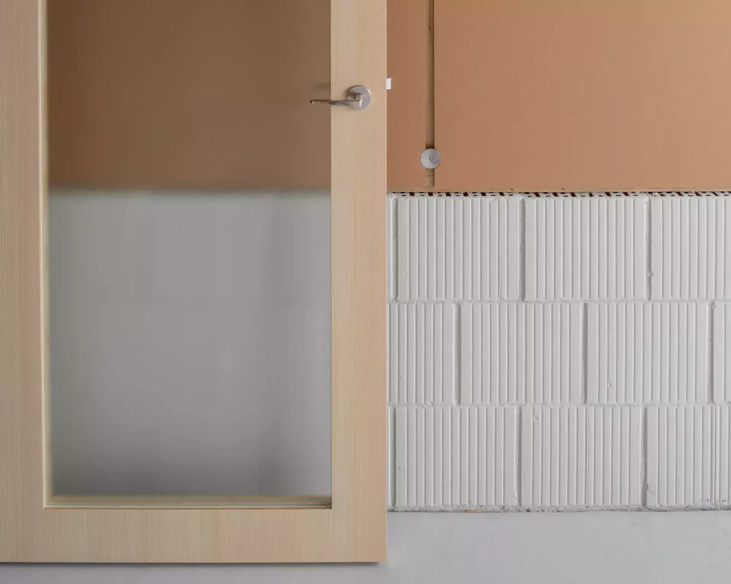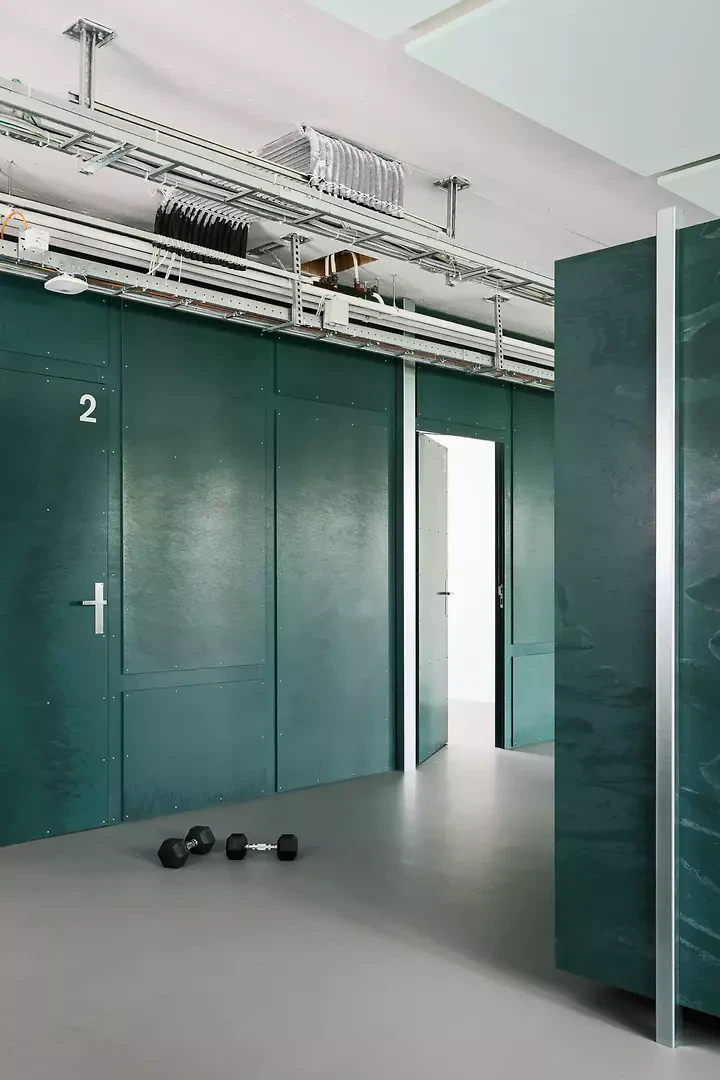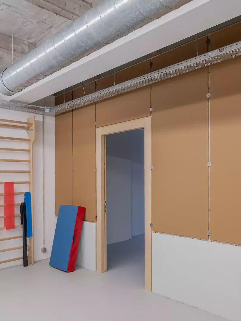 Une paroi en carton alvéolaire utilise un matériau courant et très léger comme élément de séparation fonctionnel. De larges rondelles de fixation rendent le système d’assemblage lisible, tandis que des portes en bois et des socles en briques peintes en blanc protègent durablement les zones soumises à des sollicitations mécaniques.