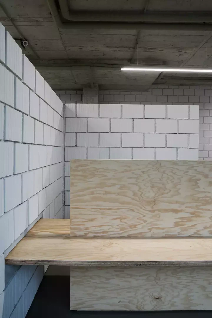 Une paroi en carton alvéolaire utilise un matériau courant et très léger comme élément de séparation fonctionnel. De larges rondelles de fixation rendent le système d’assemblage lisible, tandis que des portes en bois et des socles en briques peintes en blanc protègent durablement les zones soumises à des sollicitations mécaniques.