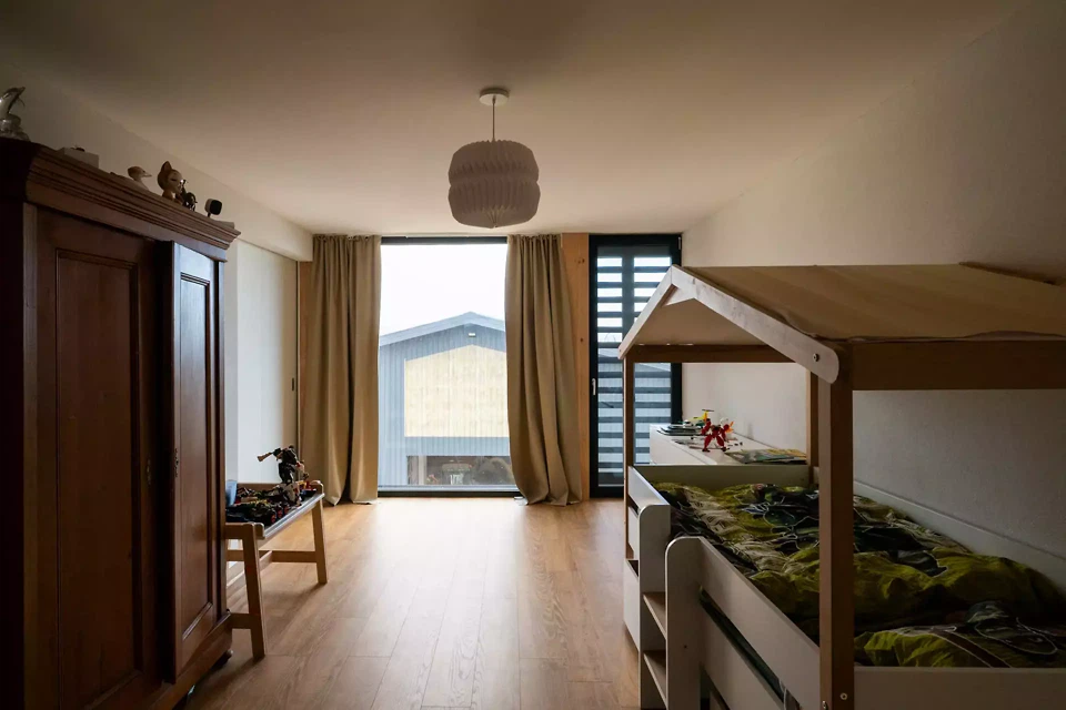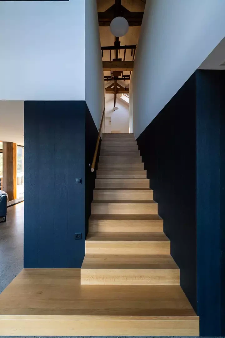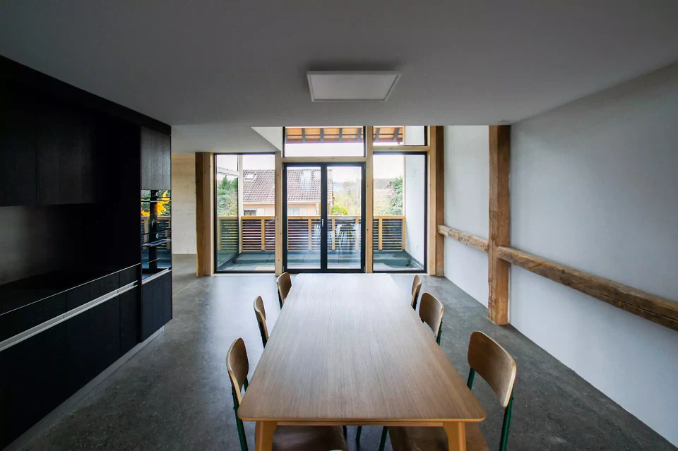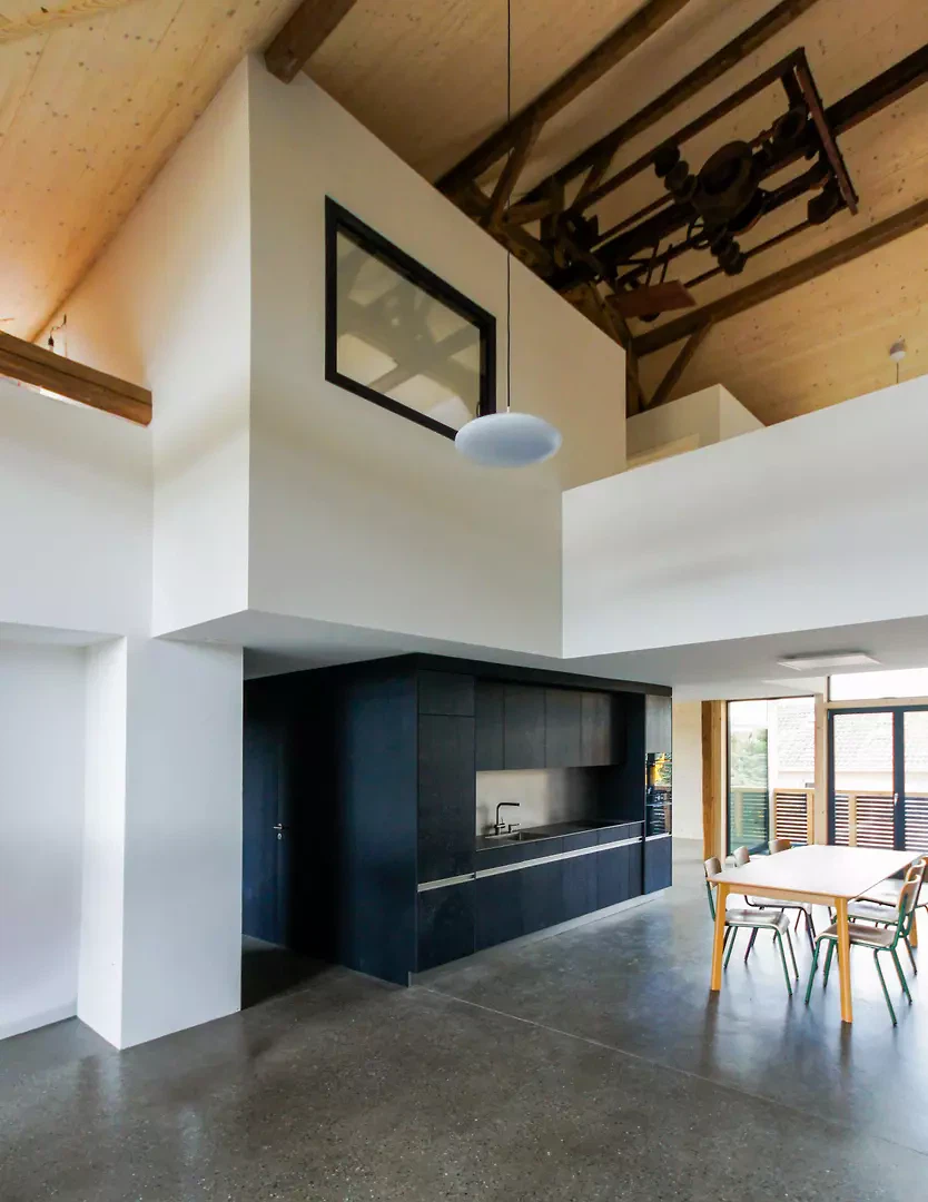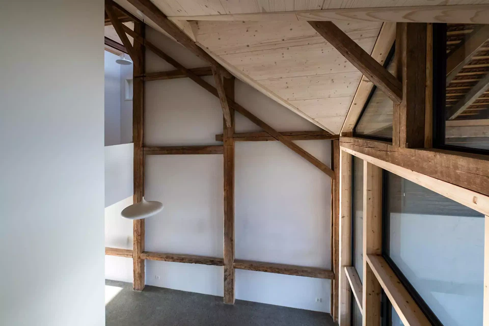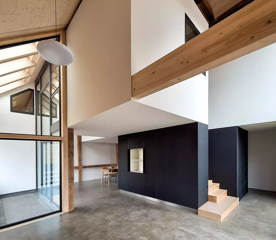 Ce volume étant trop grand pour les besoins de la famille et le budget étant défini, la grange a été isolée du premier étage jusqu’à la toiture. a l’intérieur de ce volume chauffé, un concept de boîtes suspendues dans la charpente permet de créer des pièces de taille plus raisonnable pour s’isoler de la pièce à vivre. la cuisine au centre de la maison cache un escalier qui permet d’accéder aux chambres et salles de bains dans les boîtes suspendues à l’étage. ce volume vide monumental à l’intérieur de la maison permet de ne jamais perdre la qualité spatiale caractéristique du pont de grange d’origine.