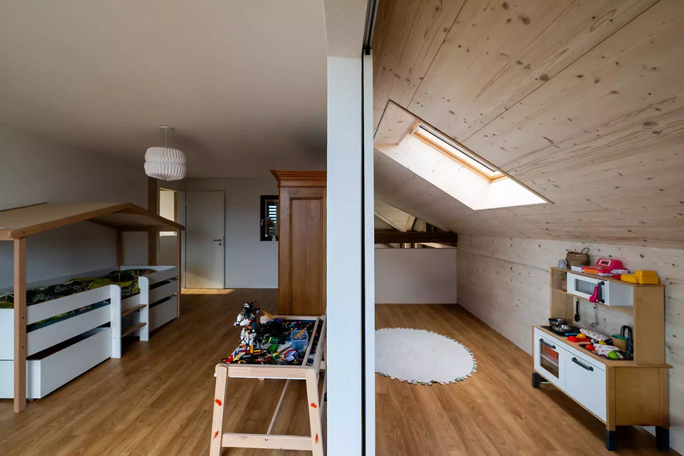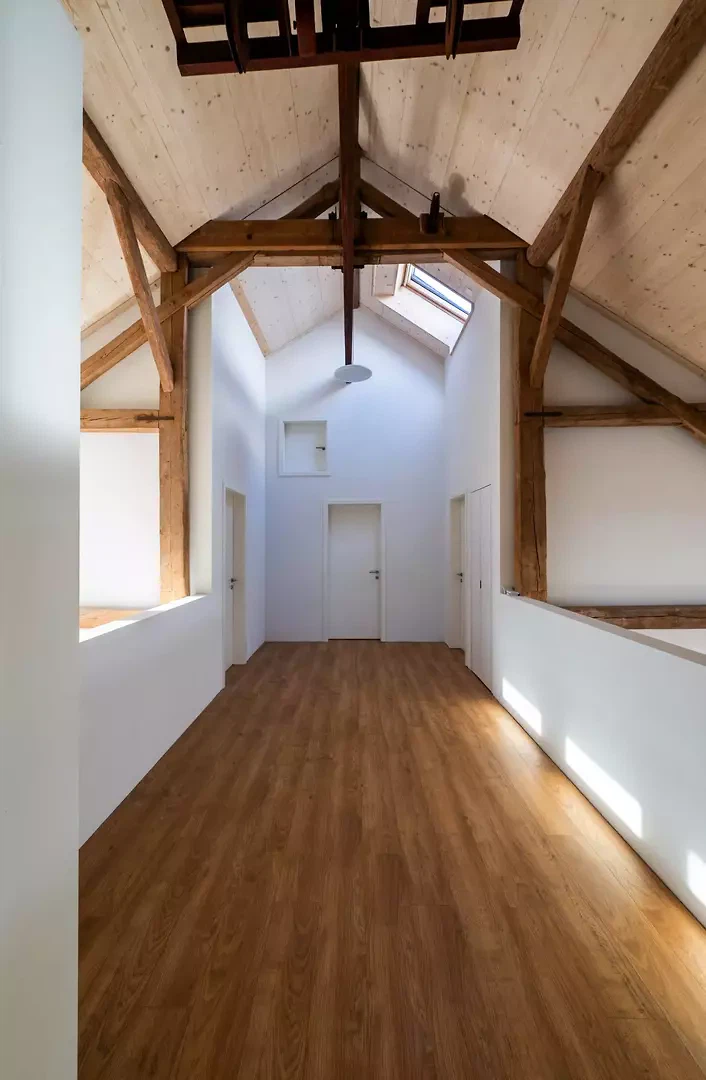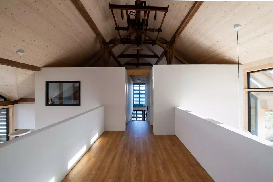 La transformation du pont de grange d’une ferme vaudoise traditionnelle en un logement familial, en conservant un volume intérieur monumental tout en créant des volumes habitables plus raisonnables grâce à des boîtes suspendues.