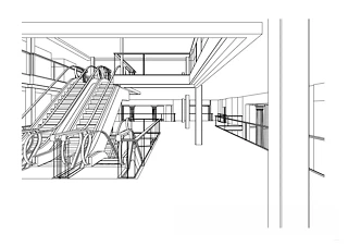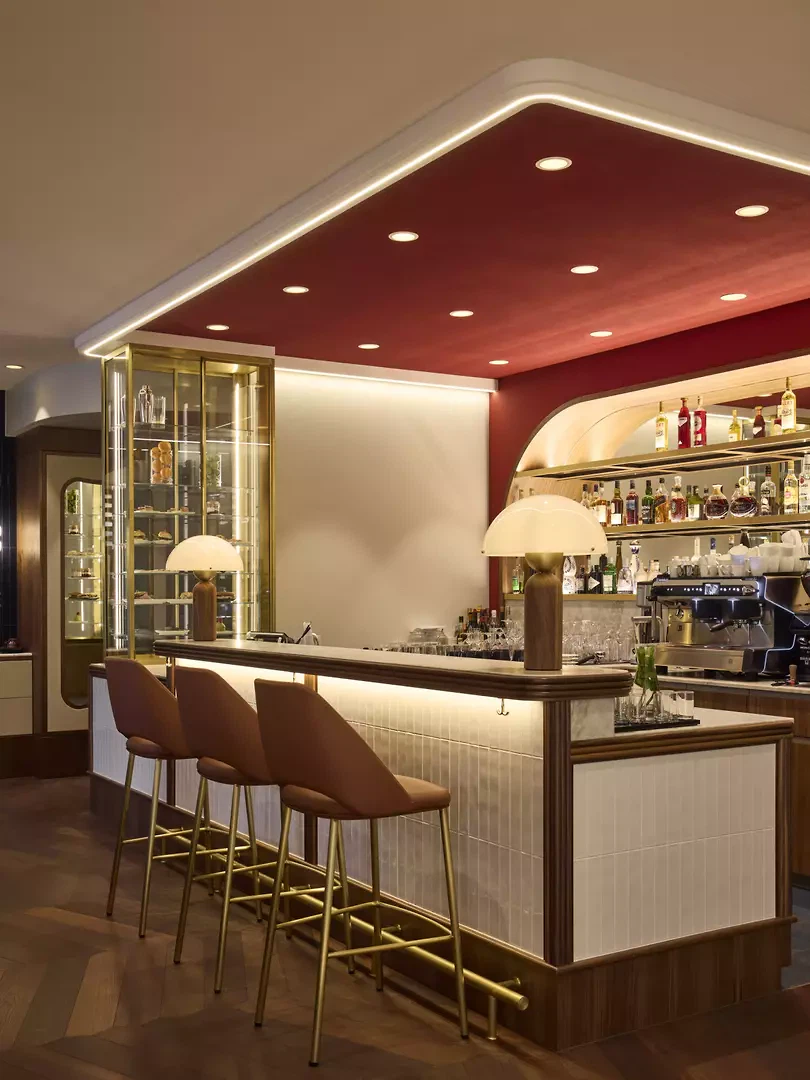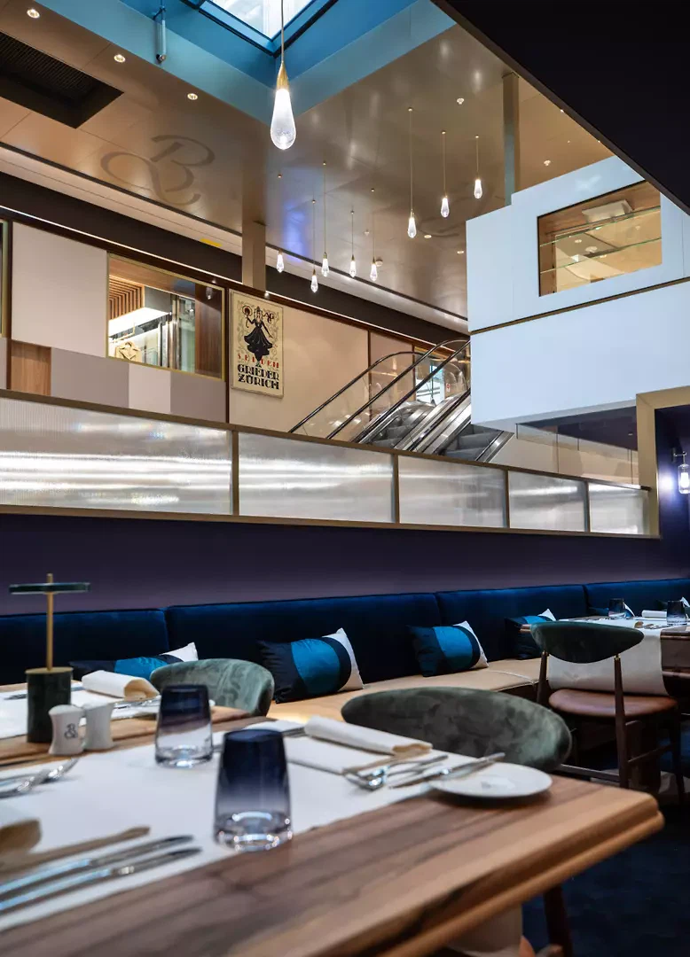 L’accès situé sur la Bahnhofstrasse mène au plus représentatif des deux noyaux excentrés où sont regroupées les principales fonctions de service. On accède depuis là aux espaces de bureaux spacieux et ouverts des étages supérieurs, ainsi qu’à la terrasse en toiture. Banquier·ère·s se pressent et disparaissent dans l’ascenseur après avoir patienté·es quelques instants dans un vestibule aux matérialités élégantes, et qui témoigne de l’expression générale sobre et noble du bâtiment. Ouvert et large, l’escalier offre une expérience spatiale proche de la méditation. Les veines blanches des pierres calcaires noires de Saint-Michel sur les marches et les murs rappellent les reflets à la surface de l’eau, les veinures du placage en bois d’olivier italien couleur miel sur les mains courantes ont un effet presque ornemental et les grands luminaires en verre fabriqués à la main diffusent une lumière tamisée. Le cheminement, les perspectives et les proportions établissent de manière générale une hiérarchie subtile qui rappelle subtilement la splendeur de l’ancienne bourse. L’ornement n’est toutefois pas le garant principal de l’impression générale de générosité spatiale. Ce rôle revient à la minutieuse coordination dont ont fait l’objet hauteur, éclairage et matériaux. En parallèle, le socle et le sous-sol abritent sur environ 4000 mètres carrés un espace commercial à plusieurs étages du grand magasin de luxe Bongénie, conçu par le cabinet d’architecture et de décoration d’intérieur genevois Version B. L’espace de restauration attenant a été imaginé par les designers parisiens de la Maison Sarah Lavoine. Les différents niveaux sont desservis par des escaliers roulants et un ascenseur qui permettent aussi d’accéder à une mezzanine éclairée par l’atrium sous lequel elle se situe. Son existence enrichit l’impression spatiale et crée des perspectives visuelles entre les différents niveaux – un dispositif important pour la perméabilité de l’espace non seulement à l’intérieur, mais aussi pour les passant·e·s dans la rue.