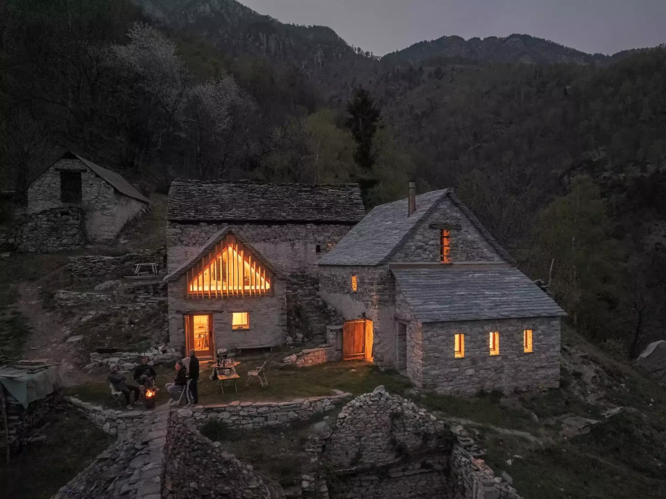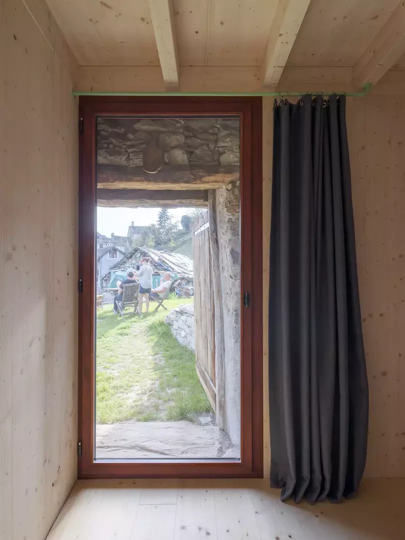 Le projet met l’accent sur la préservation des qualités des rustici. Les interventions sont conçues de manière à ce que ces constructions modestes conservent leur expression traditionnelle et leur dignité. Des mesures simples et sincères sont mises en œuvre afin de rétablir et d’améliorer la qualité d’usage des bâtiments dans le cadre de leur nouvelle affectation. L’enveloppe extérieure en maçonnerie de granit est conservée dans son caractère et restaurée si nécessaire. Les toitures en pierres de granit sont reconstruites selon les techniques artisanales traditionnelles. À l’intérieur des structures existantes en pierre, une nouvelle construction en bois, réalisée en éléments préfabriqués en épicéa, est insérée. Cette structure en bois constitue la nouvelle organisation intérieure des bâtiments et devient en même temps le matériau visible dans les espaces intérieurs. Cette matérialisation cohérente exprime une manière de construire honnête et établit un contraste avec la matérialité dure et massive de la façade extérieure en pierre naturelle de granit. La construction en bois est conçue avec une épaisseur minimale, afin d’éviter des problèmes de physique du bâtiment tout en conservant un maximum d’espace habitable à l’intérieur. L’usage principalement saisonnier, durant les périodes chaudes, confirme cette approche constructive et permet une réduction consciente des matériaux. Celle-ci répond de manière pertinente aux enjeux spatiaux, écologiques et économiques du projet. Les deux rustici sont accessibles depuis l’amont et l’aval. Dans le rustico principal, l’accès supérieur mène à un espace combinant séjour avec cheminée, salle à manger et cuisine, ainsi qu’à un escalier en colimaçon menant à l’étage de nuit. Un noyau en bois inséré y organise la séparation entre la zone de couchage et le vestiaire, tout en intégrant l’accès aux toilettes et à la douche. Dans l’ancienne annexe d’étable du grand rustico, une chambre d’amis a été aménagée. Le petit rustico est conçu comme un loft ouvert, avec un espace de couchage sous la toiture et un espace de vie avec cuisine au niveau inférieur. Dans les deux bâtiments, l’organisation intérieure vise une efficacité spatiale maximale. En raison de l’espace restreint, de nombreux éléments intégrés remplissent plusieurs fonctions. Par exemple, l’échelle menant à l’étage supérieur fait également office de vestiaire et de support pour les ustensiles de cuisine. Les espaces de couchage sont clairement séparés des zones de séjour, de repas et de cuisine dans les deux rustici.