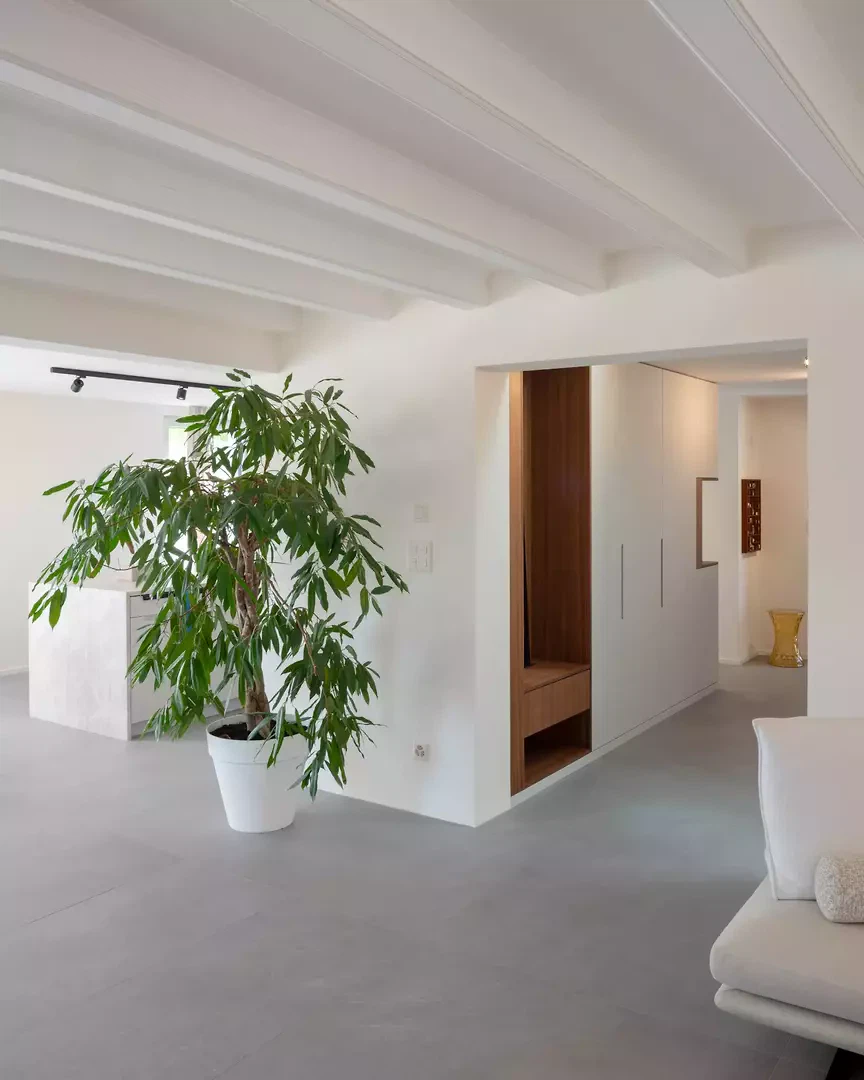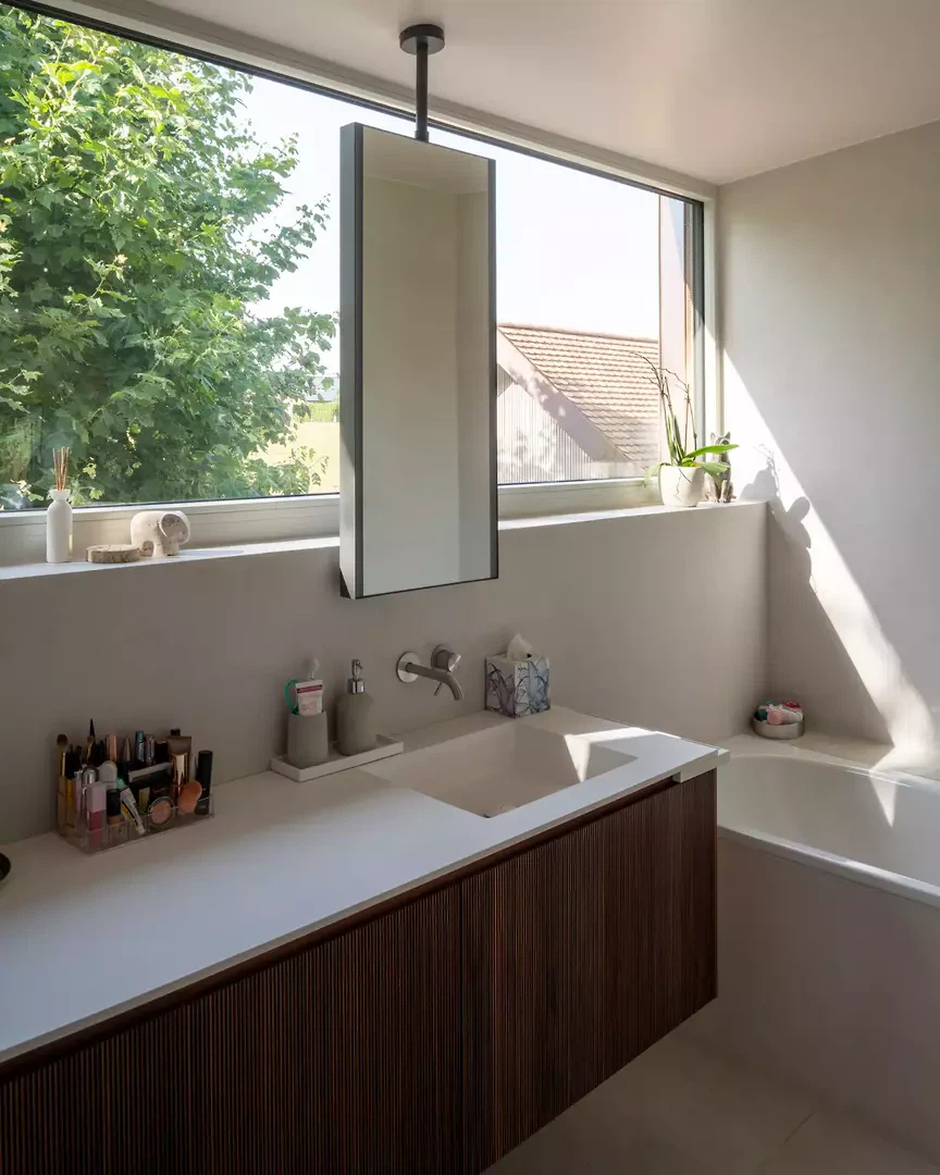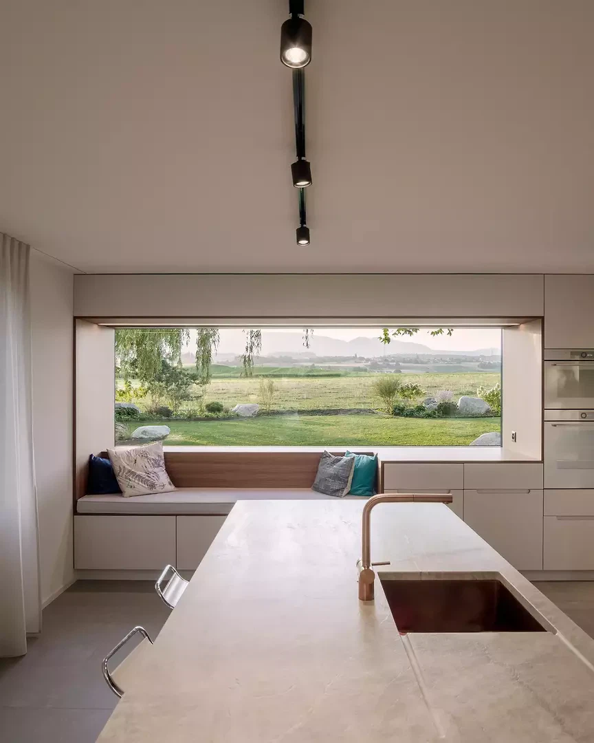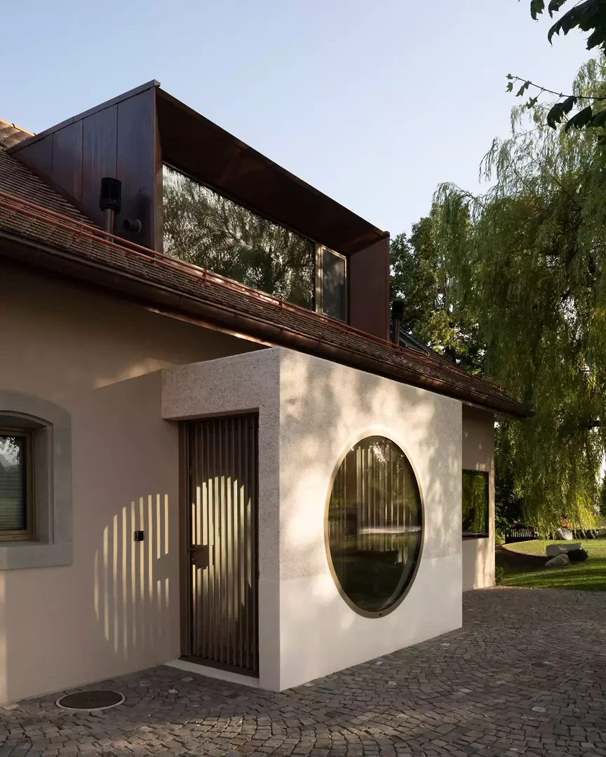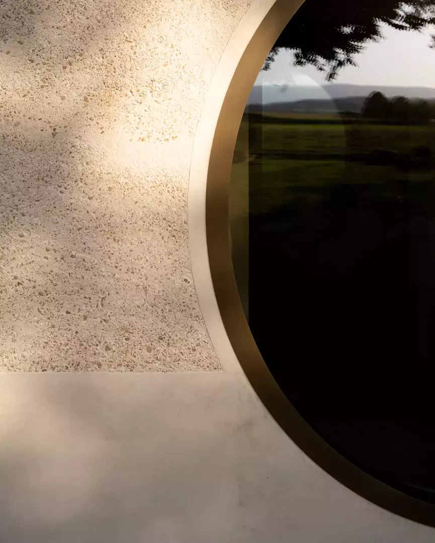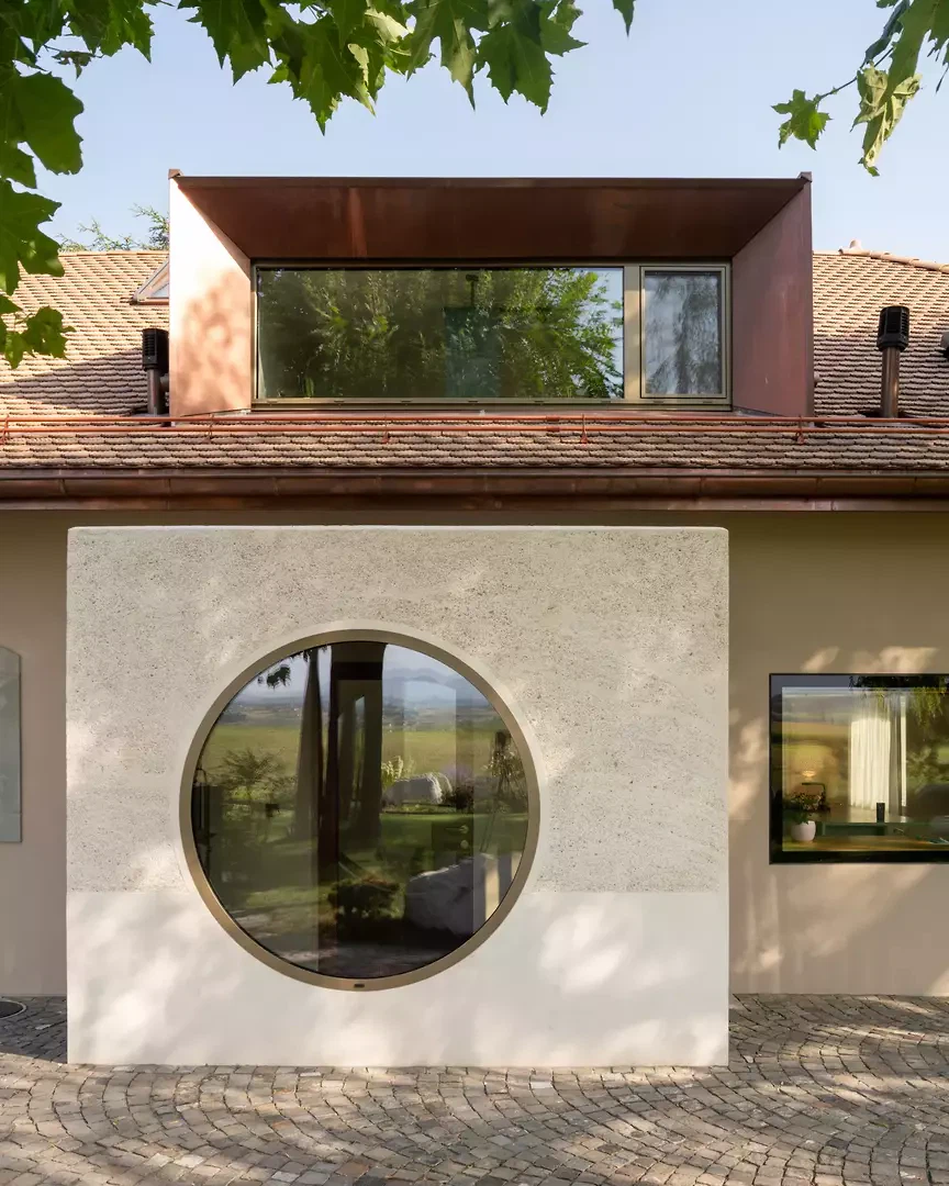 L'entrée est repensée pour créer un apparent blanc, un béton sculptural et minéral. Une grande fenêtre circulaire intégrée, placée sur le parcours asiatique du Master of Arts, instaure un dialogue subtil entre souvenirs, personnel et architecture contemporaine. À l'intérieur, le plan est entièrement repensé pour fluidifier les parcours et ouvrir les espaces de vie. Une large vue panoramique sur les environs, actuellement de part et d'autre de la cuisine, agrandit visuellement l'espace et prolonge la perspective de l'espace de vie dans une perspective environnementale. Le projet intègre des améliorations extérieures, avec la requalification du jardin et l'installation d'une piscine, qui inspirent la transformation et une cohérence globale entre l'architecture, le design et le paysage.