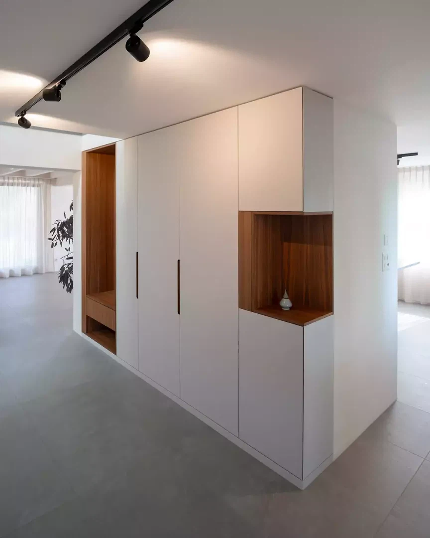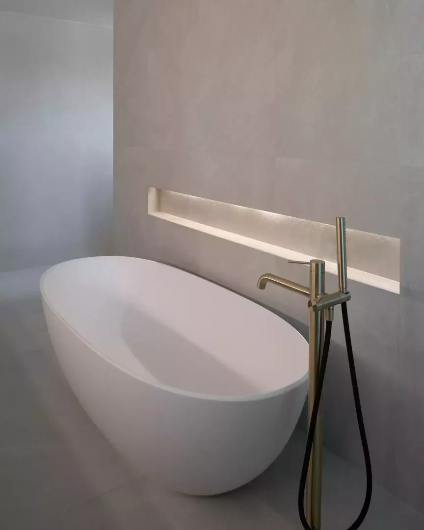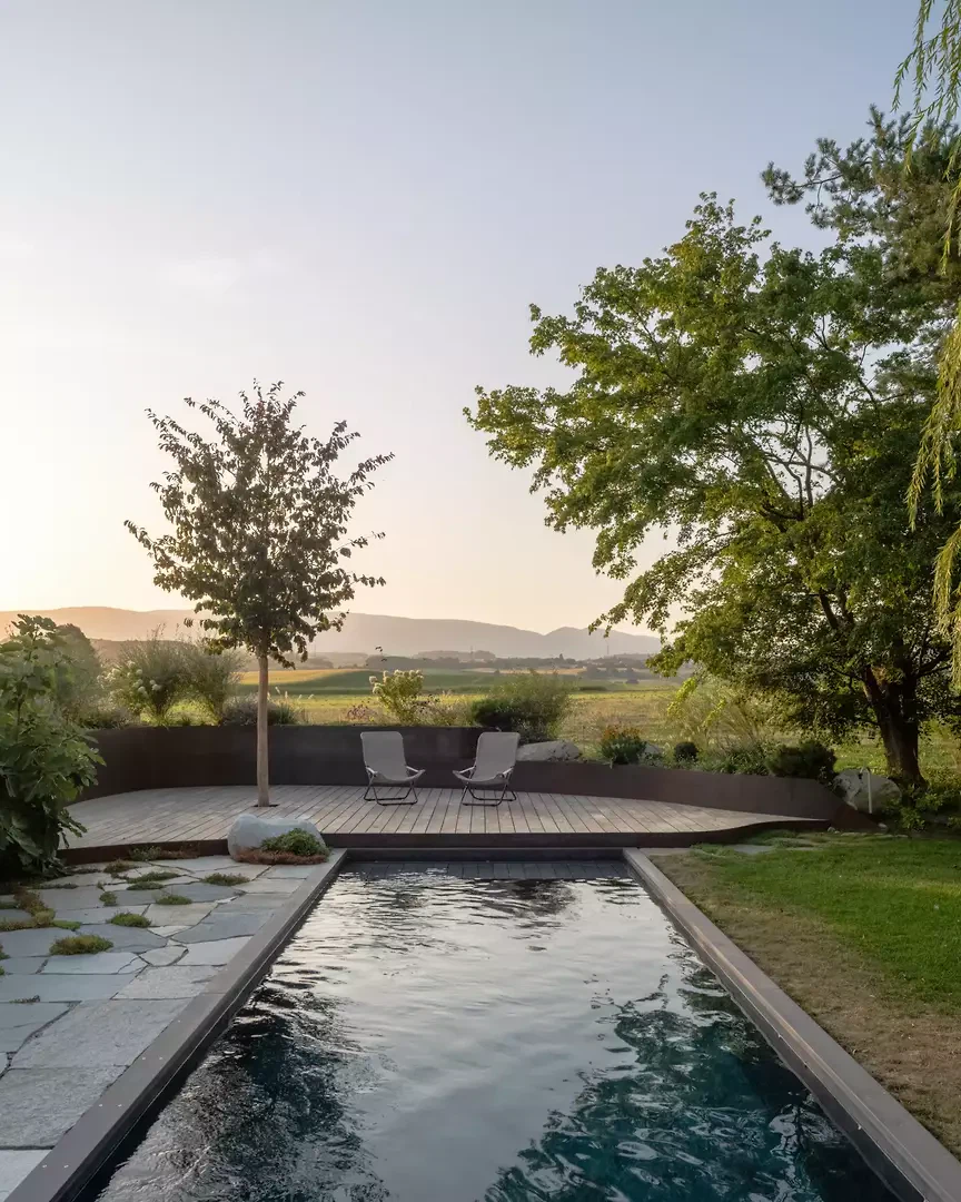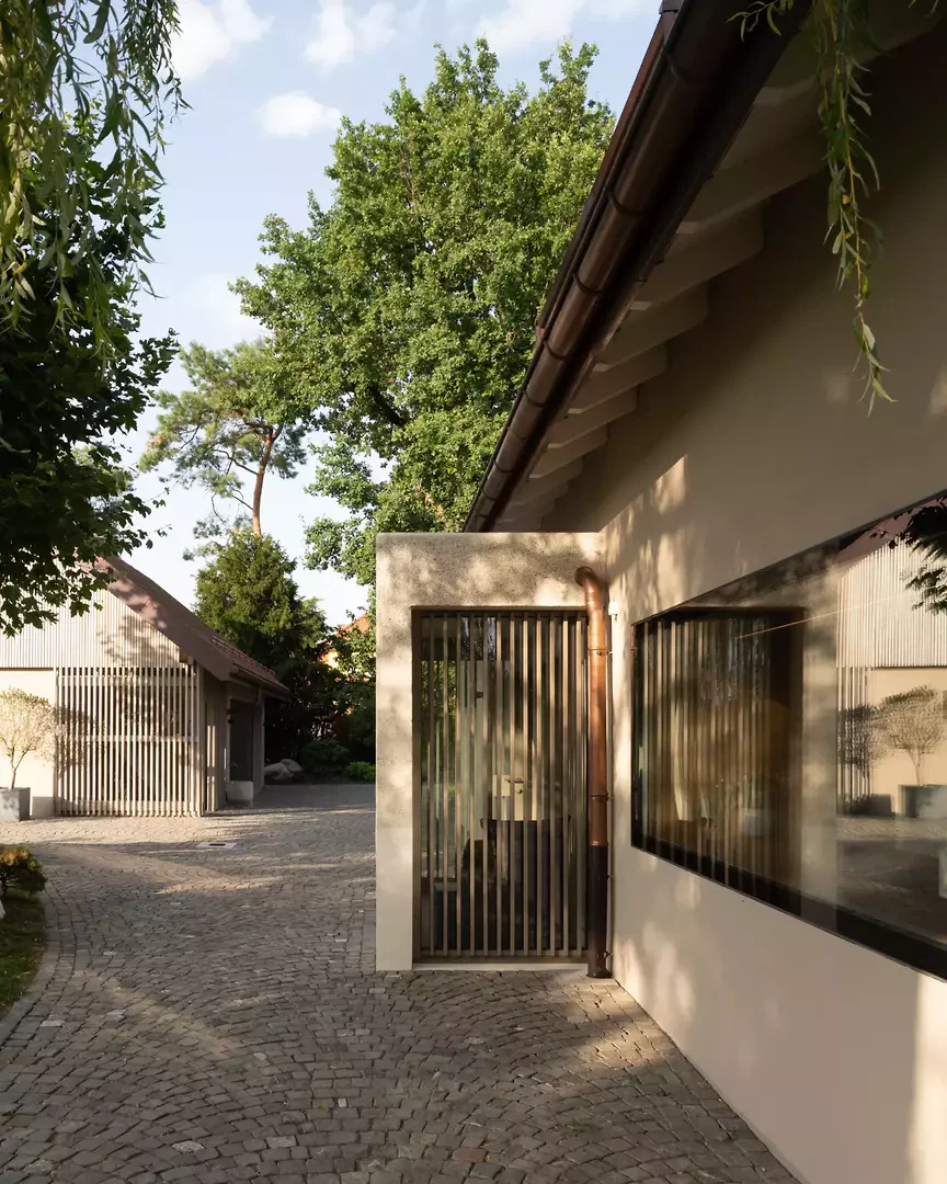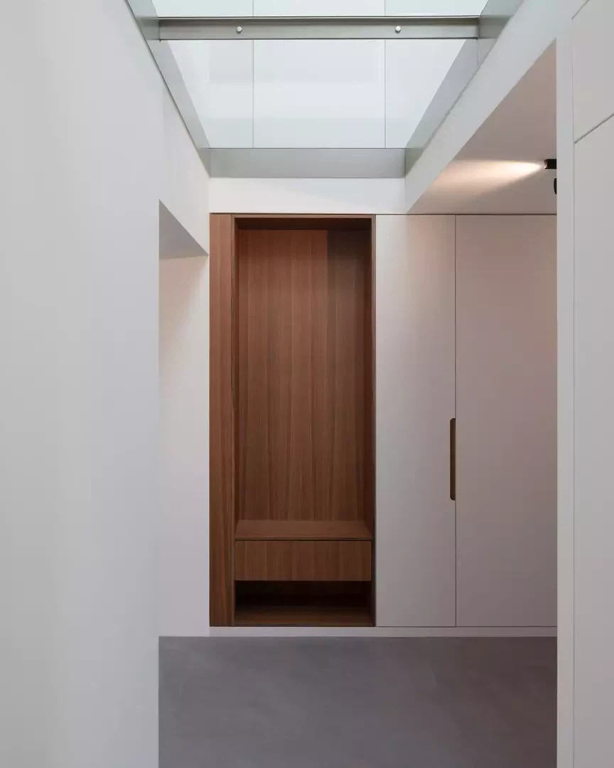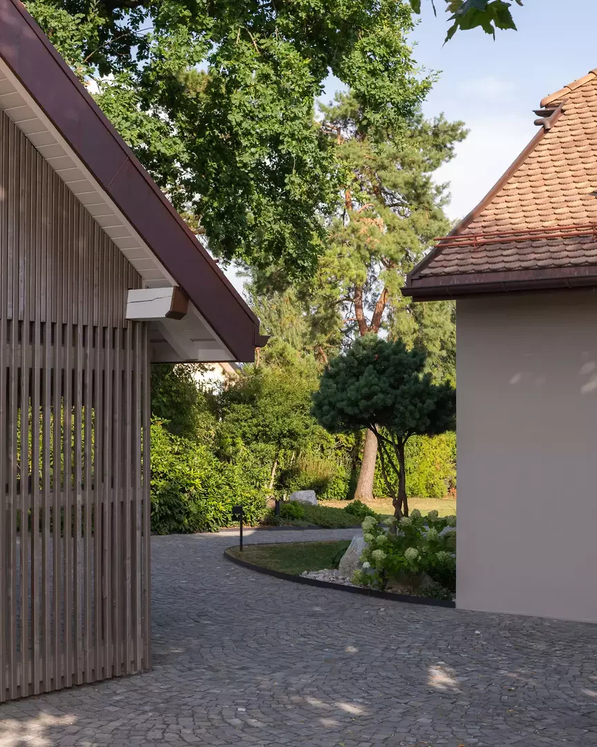 L'entrée est repensée pour créer un apparent blanc, un béton sculptural et minéral. Une grande fenêtre circulaire intégrée, placée sur le parcours asiatique du Master of Arts, instaure un dialogue subtil entre souvenirs, personnel et architecture contemporaine. À l'intérieur, le plan est entièrement repensé pour fluidifier les parcours et ouvrir les espaces de vie. Une large vue panoramique sur les environs, actuellement de part et d'autre de la cuisine, agrandit visuellement l'espace et prolonge la perspective de l'espace de vie dans une perspective environnementale. Le projet intègre des améliorations extérieures, avec la requalification du jardin et l'installation d'une piscine, qui inspirent la transformation et une cohérence globale entre l'architecture, le design et le paysage.
