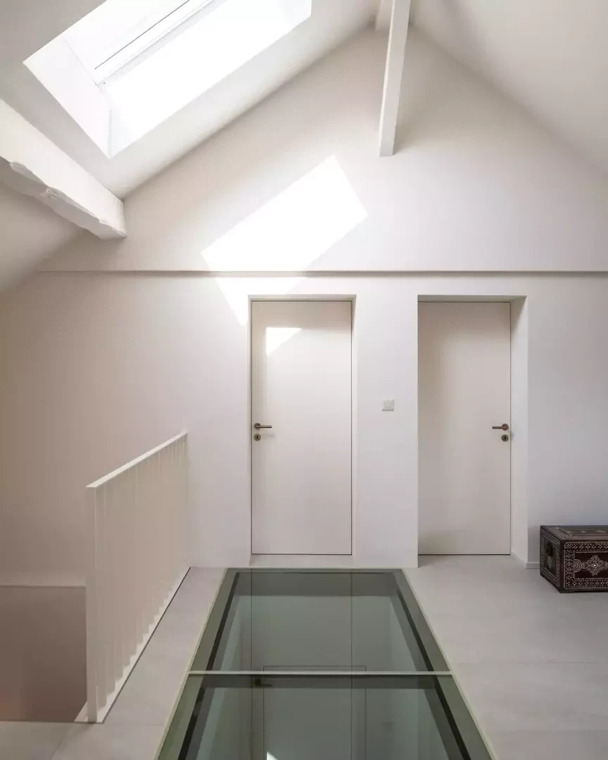 Transformation et bilan énergétique complet d'une villa de maître vaudoise des années 1960, ce projet interroge la capacité d'un patrimoine ordinaire à se réinventer sans perdre son identité. L'intervention s'applique à une lecture attentive de l'existant: volumes généreux, structure rationnelle, mais un cœur de maison sombre et peu lisible. Le geste fondateur consiste à ouvrir la dalle du premier étage pour y intégrer un plancher de verre, permettant à la lumière zénithale captée en toiture de pénétrer profondément dans l'habitation. Cette incision verticale transforme radicalement l'ambiance intérieure : les circulations sont lumineuses, le centre de la maison respire, et la lumière naturelle s'écarte de la structure du projet.