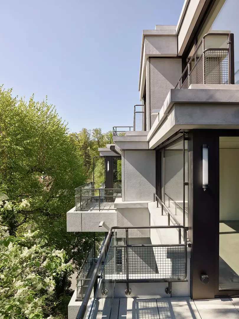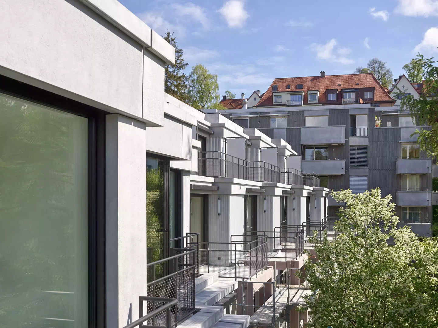 Le niveau de finition crée, avec une simplicité élégante, une atmosphère contemporaine et chaleureuse, tout en mettant en valeur les éléments de construction conservés de l'édifice d'origine. Les planchers et les poteaux existants ont été renforcés en béton coulé sur place; les éléments en béton à l'intérieur des appartements ont été sablés; les cages d'escalier et les poteaux de balcon ont été conservés sous forme d'éléments en béton lors de leur reconstruction. Les surélévations ont été réalisées selon les contraintes statiques en utilisant une construction à ossature bois. Le revêtement de façade complète et harmonise les bâtiments sous la forme d'une construction suspendue et ventilée, avec des revêtements composés d'éléments en béton léger renforcé de fibres de verre et de tôles profilées spécialement conçus.