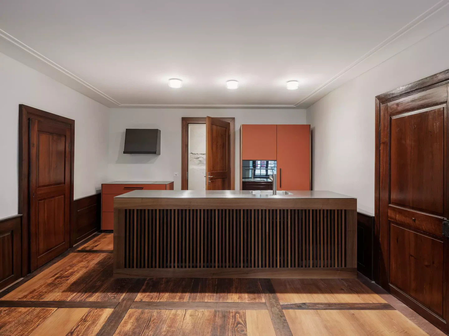 La question centrale du projet était de savoir comment intégrer les besoins actuels en matière d’habitat dans un ensemble historique sans en détruire les structures spatiales caractéristiques. Le concept architectural s’inscrit ainsi directement dans l’ordre existant: la cage d’escalier centrale dessert, à chaque étage, deux grandes pièces et une pièce plus petite. Six appartements sur un étage et en duplex ont été intégrés à cette structure, complétés par un magasin et un atelier au rez-de-chaussée ainsi qu’une salle de réception semi-publique dans la cave voûtée. Dans les grandes pièces à vivre des premier et deuxième étages, la cuisine joue le rôle d’élément structurant. Elle organise la salle de bains et la chambre à coucher tout en préservant les proportions historiques des pièces. Dans les autres pièces, la structure existante a dicté la disposition des espaces.