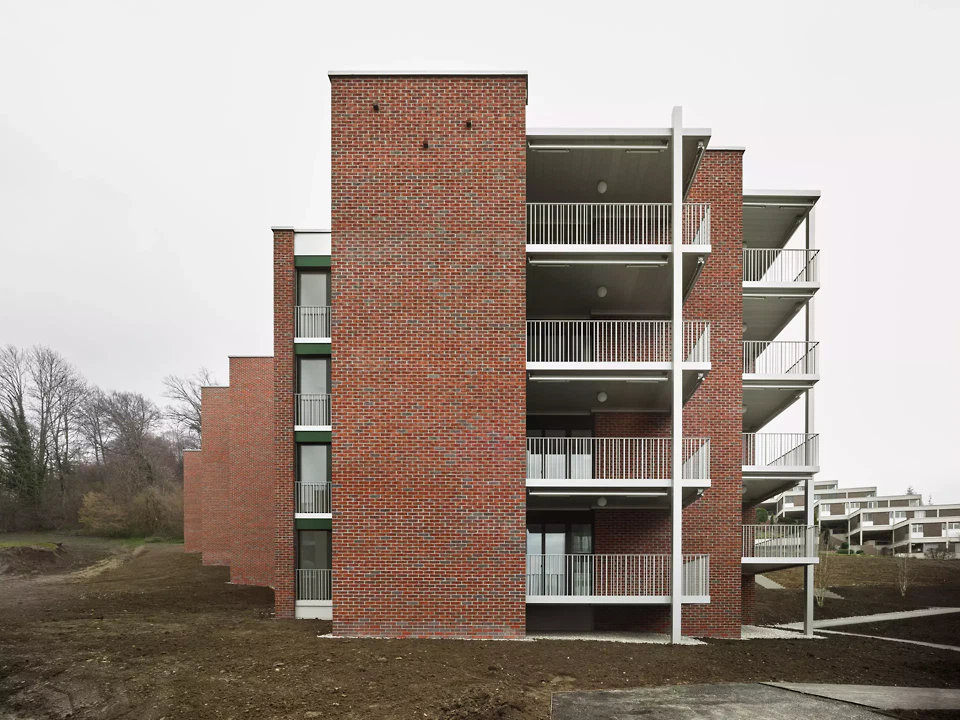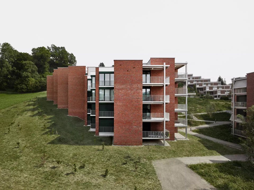 La molasse du Zugerberg caractérise la topographie boisée du « Vogelwinkel ». Des voiles muraux en brique rouge s’insèrent dans le paysage mouvementé et en épousent les courbes du terrain. Quatre nouveaux immeubles d’habitation relient de manière perméable le tissu bâti existant à l’espace libre. La limite de l’ensemble est définie de manière transparente. Les volumes se décalent en plan et en coupe. Ils ouvrent de multiples axes visuels et créent, aux extrémités, des relations spatiales différenciées. L’immeuble en terrasses voisin de Hans Peter Ammann constitue à cet égard une référence marquante. Quatre entonnoirs d’espaces libres en forme de trompette structurent le site en chambres spatiales autonomes au caractère propre. Le chemin en lacets densifie la séquence spatiale. Selon le rapport du jury, le projet convainc par une perception précise du lieu, le respect du paysage et une mise en œuvre typologique claire. Les volumes en lames génèrent une continuité spatiale diagonale qui se prolonge dans l’étendue du paysage. L’espace extérieur pénètre jusque dans les logements. Les bâtiments suivent la topographie, qui se reflète dans les diagonales des appartements. Les relations visuelles renforcent l’unité entre architecture et paysage. Des bâtiments compacts optimisent le rapport entre surfaces utiles et volume. Des matériaux durables et des assemblages clairs garantissent une utilisation pérenne. La production d’énergie est assurée par des sondes géothermiques. Des toitures en gradins sont entièrement équipées de panneaux photovoltaïques, dont l’électricité excédentaire est injectée dans le réseau communal. 106 logements attractifs et économiques de 2,5 à 5,5 pièces voient le jour, offrant un foyer à environ 350 personnes de toutes générations. La structure architecturale reste lisible à l’intérieur et séduit par des panoramas surprenants, des séquences spatiales individuelles, des plans précis et une conception cohérente.