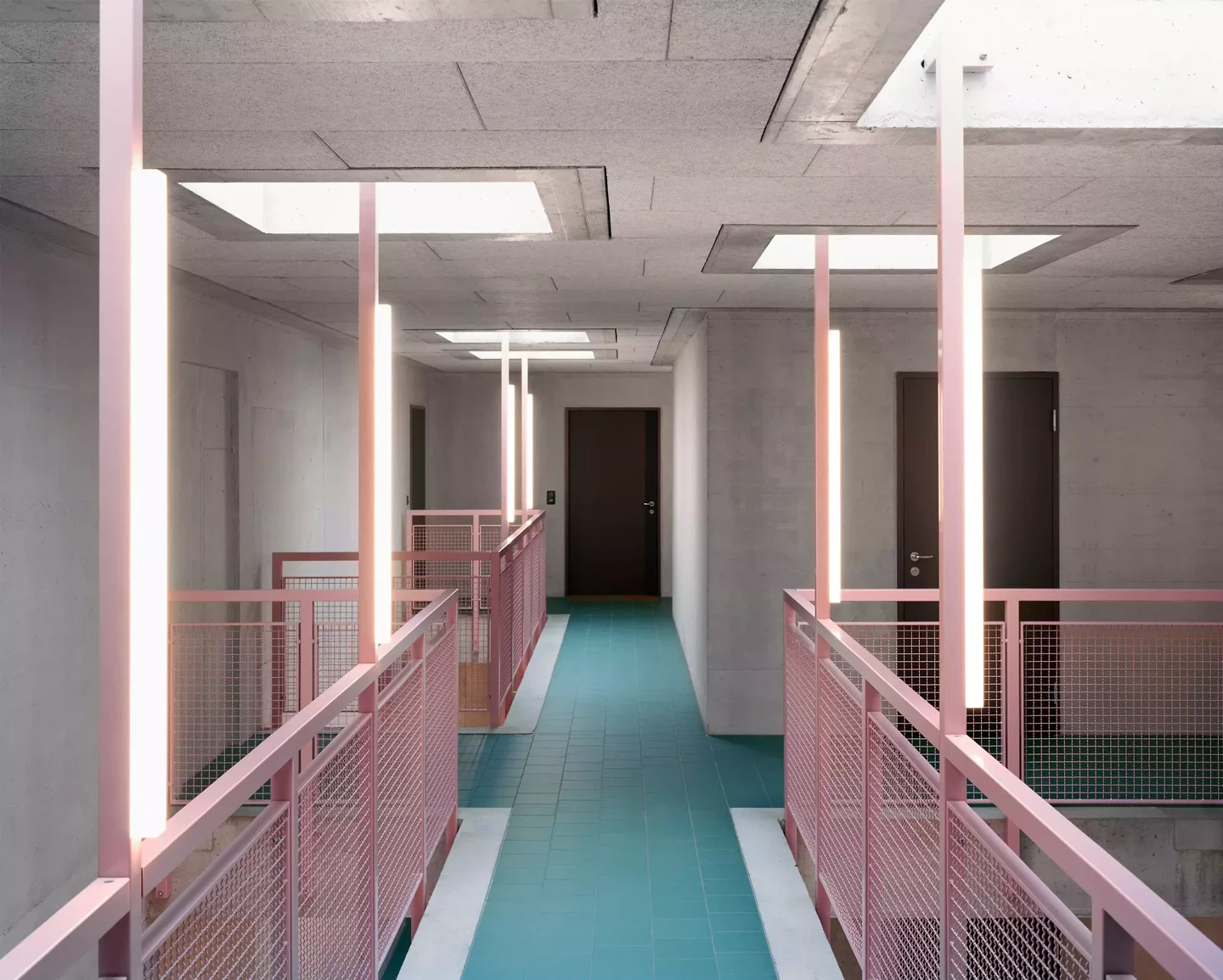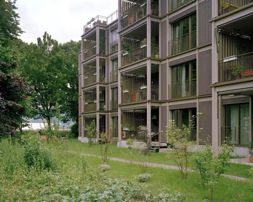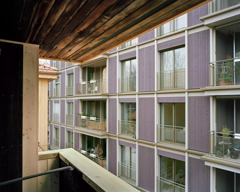 La Eichwaldstrasse se trouve à la frontière entre le centre urbain dense de Lucerne et l'Allmend avec le quartier de la caserne. Le site bénéficie ainsi à la fois de sa proximité avec le centre-ville et avec la zone de loisirs et le paysage environnants, dominés par le massif du Pilate. Le nouveau lotissement se compose de deux maisons parallèles qui encadrent une place au centre de laquelle se trouve le magasin de sel construit en 1711, qui confère au lieu son identité inimitable. Au rez-de-chaussée, les nouvelles maisons forment chacune une galerie qui, avec le grand auvent en saillie du magasin de sel, agrandit la place et donne accès aux locaux commerciaux publics au rez-de-chaussée ainsi qu'aux appartements situés au rez-de-chaussée surélevé et aux étages supérieurs. Au rez-de-chaussée du magasin à sel, à l'entrée du lotissement, se trouve un café qui anime davantage la place et est devenu un nouveau lieu de rencontre dans le quartier. À l'arrière du magasin à sel, dans l'ancienne écurie, se trouve un grand local à vélos qui peut accueillir les véhicules non motorisés du premier lotissement sans voitures de la ville de Lucerne. Les appartements sont exclusivement situés dans les nouveaux bâtiments et, grâce à leurs typologies et leurs tailles variées, offrent un nouveau foyer à une population mixte. Orientés vers le sud, tous les appartements bénéficient d'un bon ensoleillement et d'une vue sur l'Allmend et le Pilate en arrière-plan.